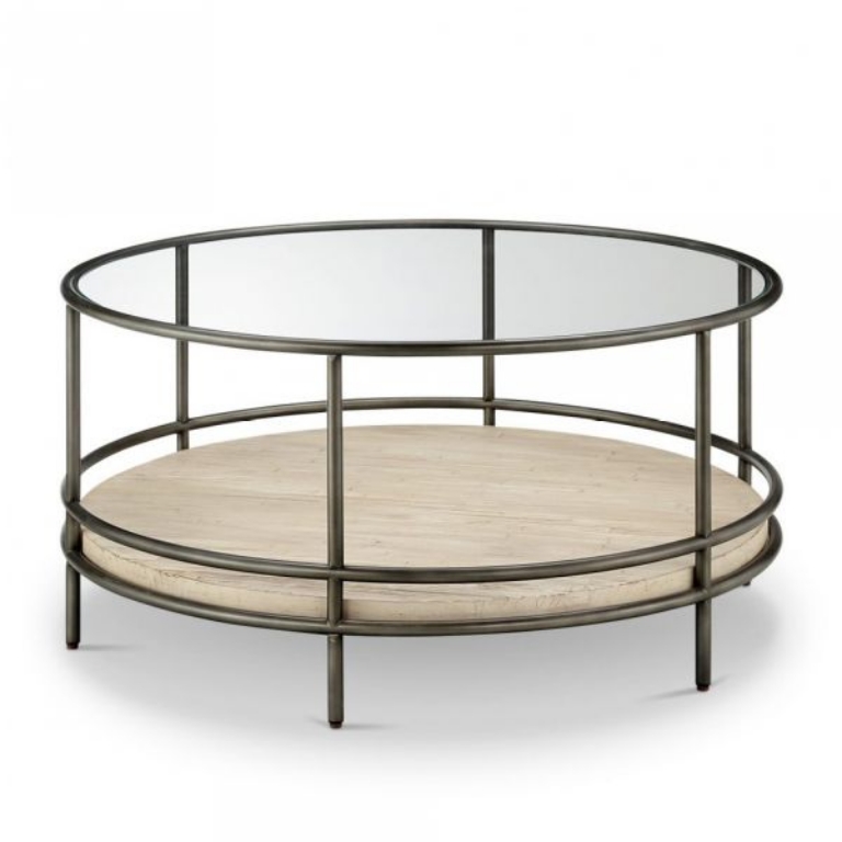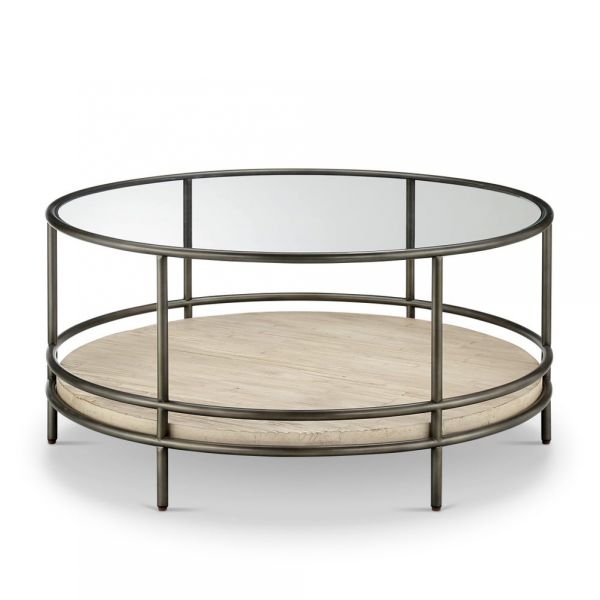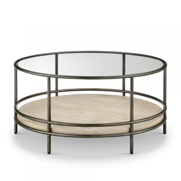 Modern style describes the Cena Collection from Magnussen Home Furnishings. Features include a 5mm tempered straight edge clear glass insert in a metal tubular frame. This 38" round table is made with a Vintage Nickel finish, and provides a natural wood storage shelf on the bottom. This table will be sure to add flair to your home decor.