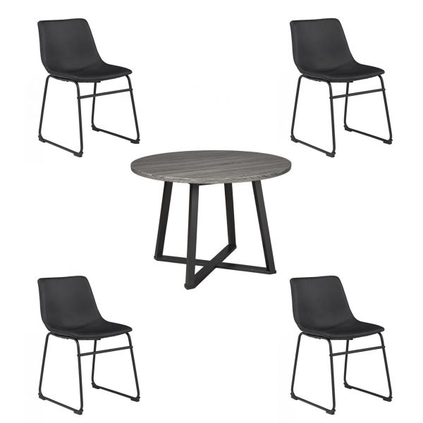 With its distinctive X-shaped metal base, the Centiar round dining table serves up a fresh twist on mid-century inspired style. Its mixed material and two-tone aesthetic are beautifully in balance. Sporting a dramatic charcoal gray hue, the top is crafted of durable melamine allowing it to weather years of family thrills and spills. Four upholstered black vinyl chairs complete this group.