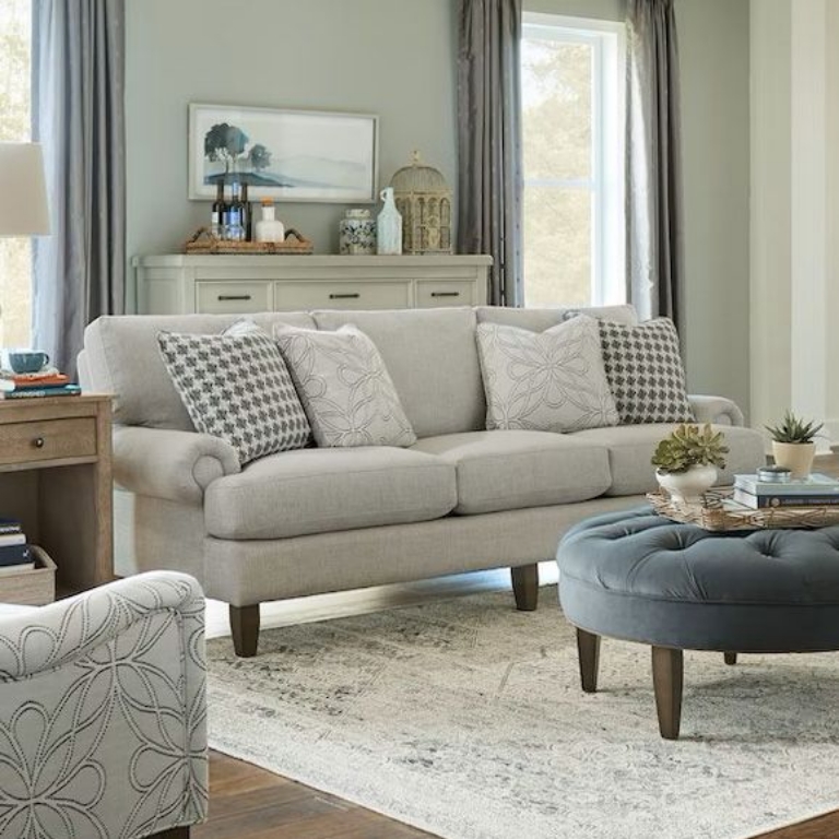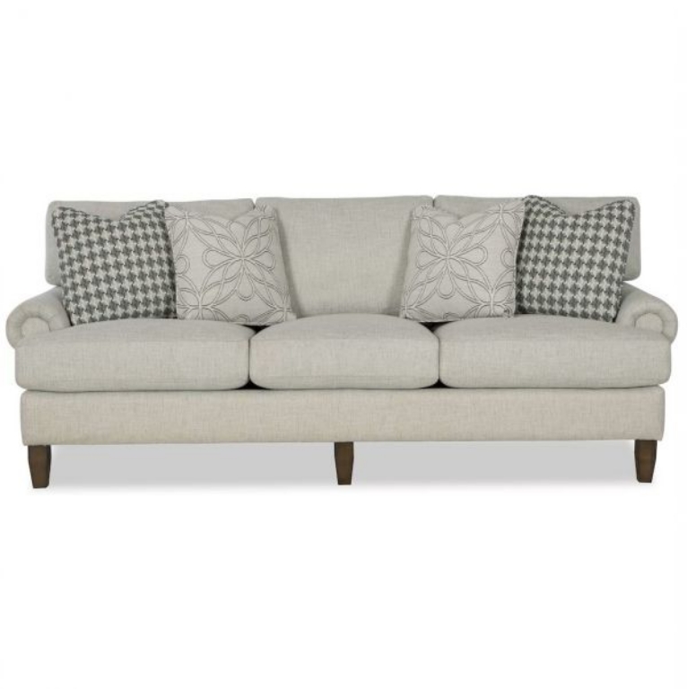 A new classic for today, this sofa from the Paula Deen Home collection has familiar style elements mixed with modern touches to create a beautiful new silhouette. Deep-set panels accent the tailored rolled arms, while French seaming on the entire piece gives a clean, simple look. This style features loose box-border backs, tall tapered legs, and Paula's exclusive Blend-Down seat cushions for a luxury look and feel. Two pairs of Blend-Down toss pillows complete the look.