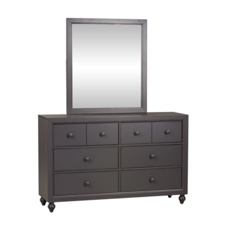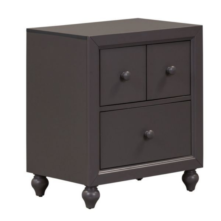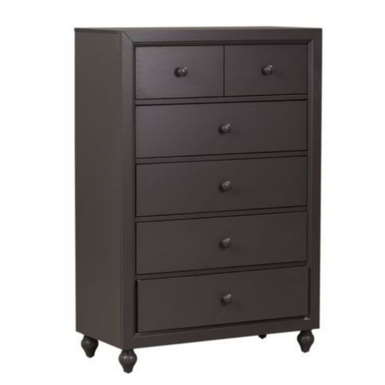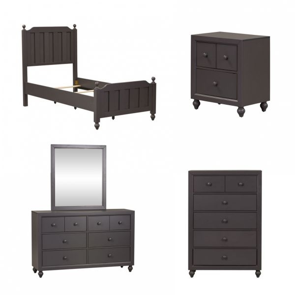 The Cottage View Full Bedroom, clean lines, conservative, but stylish. Crafted of melamine and a rubberwood solid frame, the centerpiece bed features a dark gray finish, a square post bed with round finials and slat overlays, anchored by bun feet. Never question the reliability of this bed with the hook on rails and center supported slat system. Perfect for youth, guest rooms, assisted living, small spaces and much more!