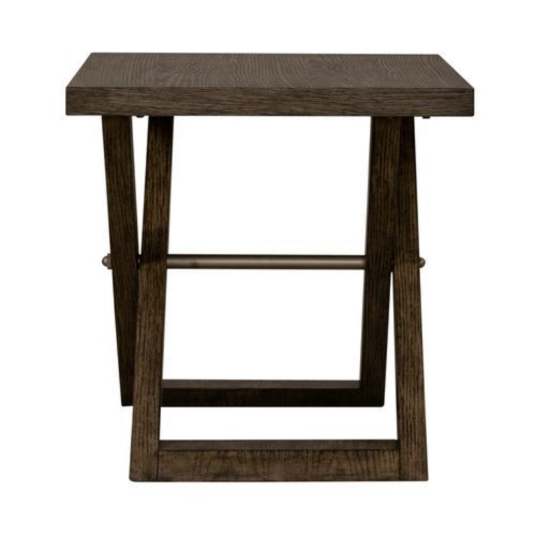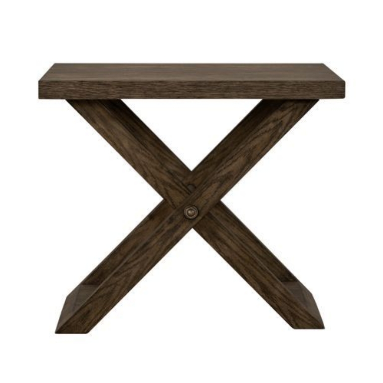 The Crossroads end table is everything your home deserves. Crafted with excellence using Rubberwood Solids and Wire-Brushed Split Heart White Oak Veneers, this table features a Russet Brown finish. The X-style open-leg base features a metal stretcher attached by two large bolts for an urban feel. Anchor any seating ensemble in a curated industrial style with the Crossroads end table.