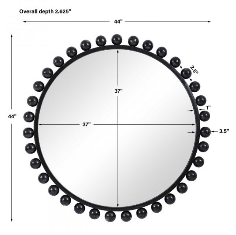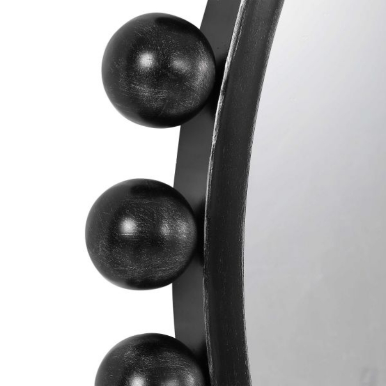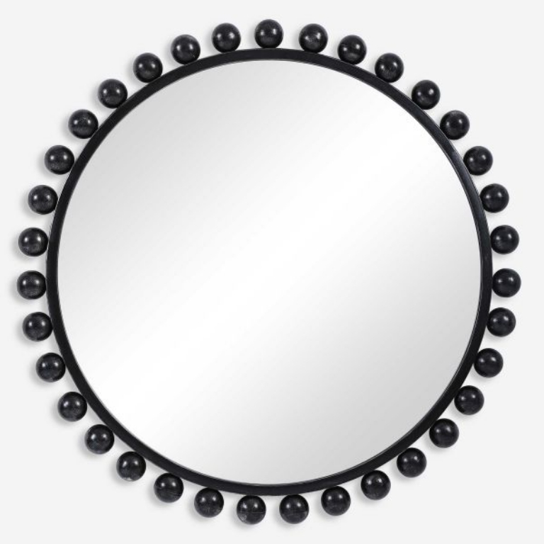 This eye-catching round mirror adds an upscale look and sophisticated style to any room by showcasing smooth iron spheres that embellish a sleek inner frame, finished in a distressed black with subtle silver undertones.