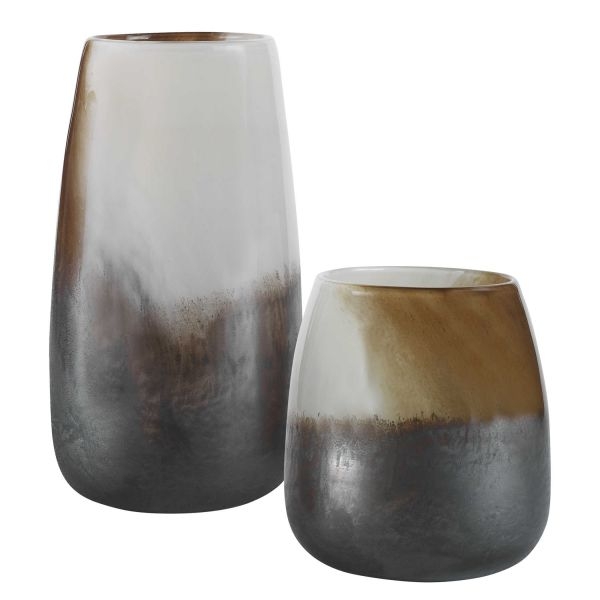 Handcrafted from glass, this set of vases showcases a unique blend of warm neutral tones from light sand to rust and dark bronze. Display on their own or paired with fresh flowers or candles.