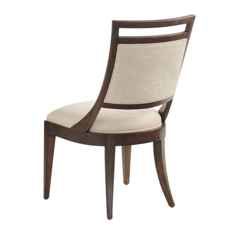 The graceful lines of the Driscoll side chair add a transitional solid look to the collection. A generous concave back and floating cap rail ensure exceptional comfort, with elegant saber legs adding refined sophistication to the design. This chair is shown here with a woven chenille fabric with an exceptionally soft hand in a golden maize coloration. The collection is crafted from walnut veneers and mahogany solids in a rich walnut finish.