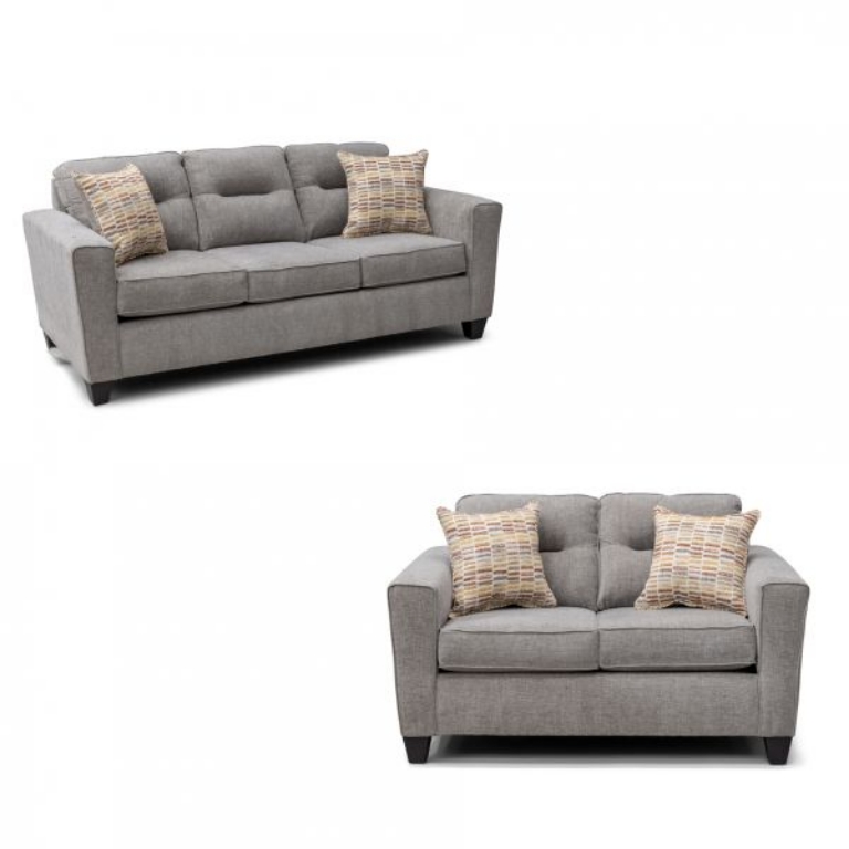 The Everleigh Taupe Sofa & Loveseat feature a slight pull in the inside back for asthetics and comfort, a square arm that narrows toward the floor with a tapered leg. The seat cushions are loose, but not reversible and the throw pillows feature a contrasting fabric on one side and a matching body fabric on the other side. The inside back cushions are semi-attached providing the softness of a loose cushion back with the tailoring of an attached back cushion.