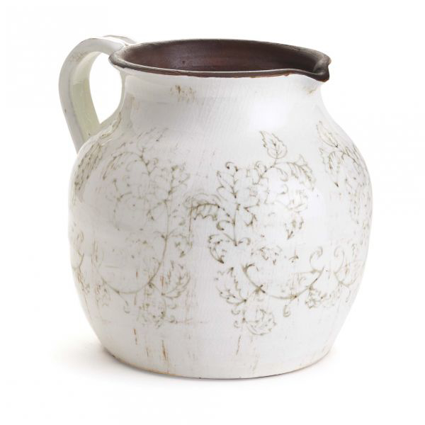 A subtle floral scrollwork adorns this classic pitcher adding a lovely, feminine touch. The finish is a high gloss crackle glaze. The beauty truly is in the details.