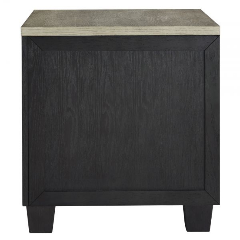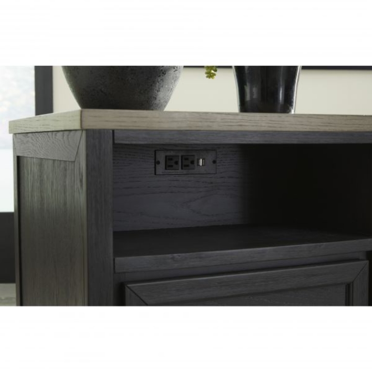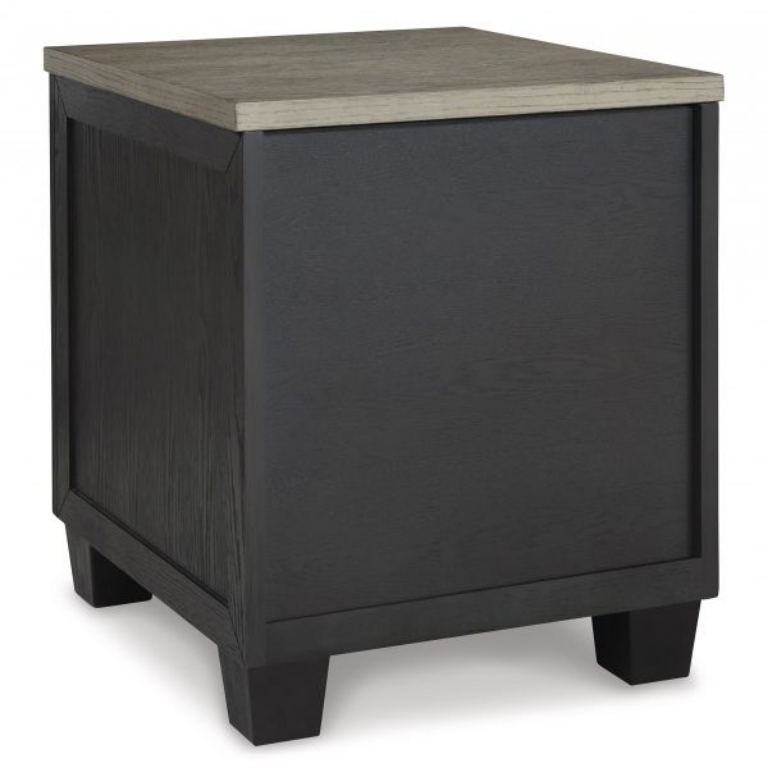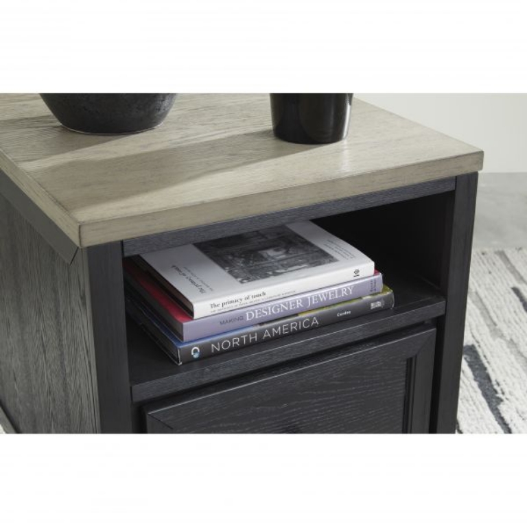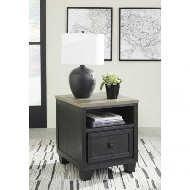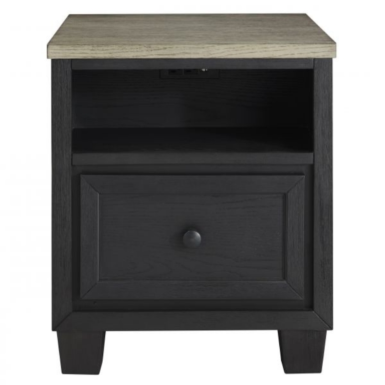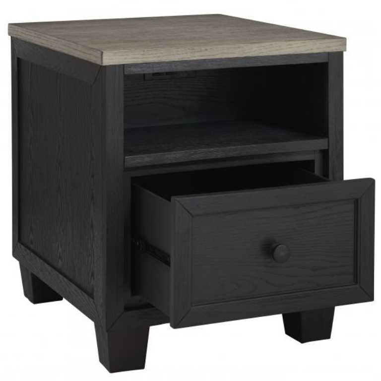 Add layers of form and function to your space with this rectangular end table. Its casual contemporary two-tone color scheme features a rich black finish accented with a dusty grayish brown wood-tone tabletop. This table's flexible design includes a single drawer and open cubby shelf for sofa-side storage, along with a power supply and dual USB charging ports.