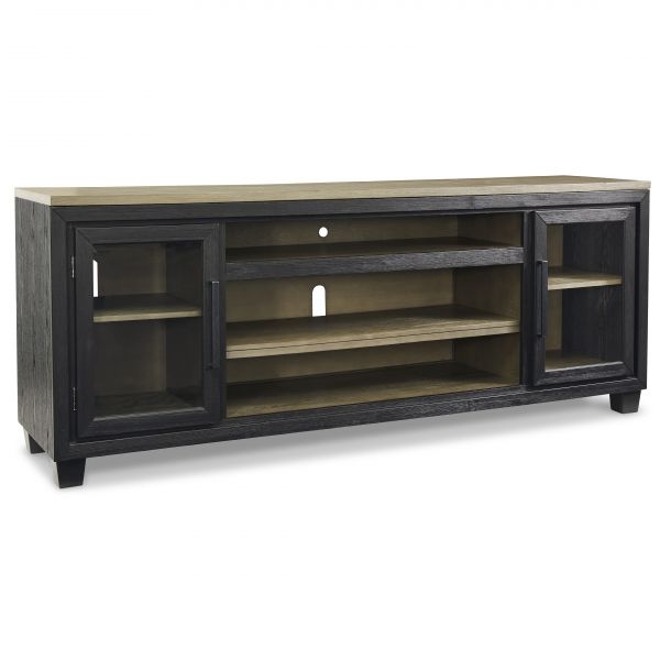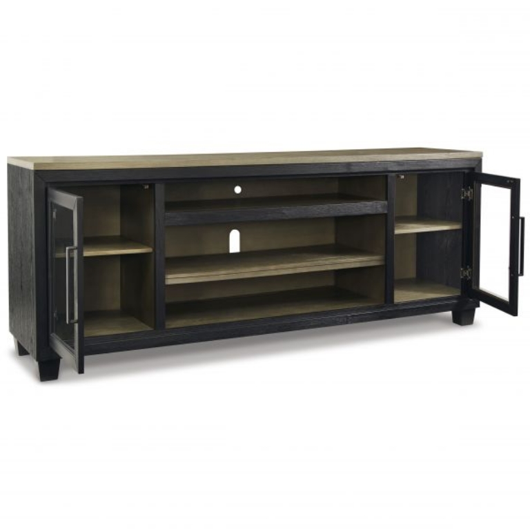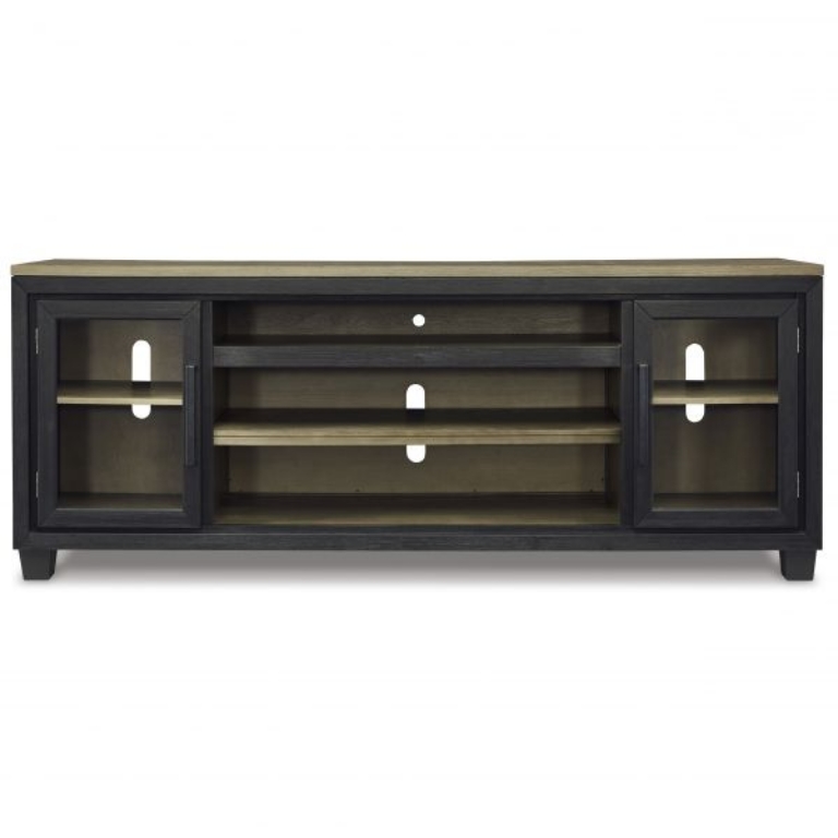 This TV stand with fireplace option is rustic, casual contemporary style simply done right. Its two-tone color scheme features a rich brushed black finish accented with a dusty grayish brown wood tone. With two glass-front cabinets (each with an adjustable shelf), an open cubby and a removable center shelf, it offers plenty of storage to house all of your electronic needs.
