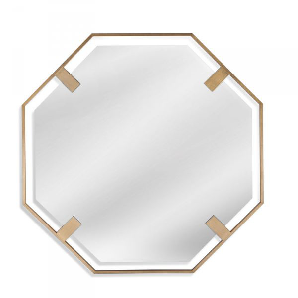 The Giorgio Wall mirror features an architectural metal frame finished in antique gold that suspends the mirror glass with four attachment points creating this dramatic effect.