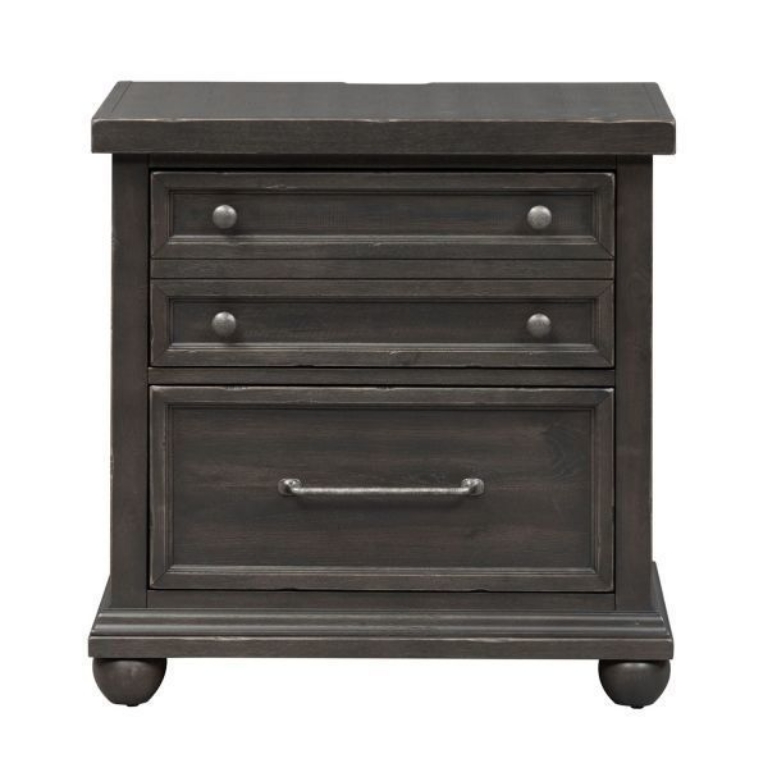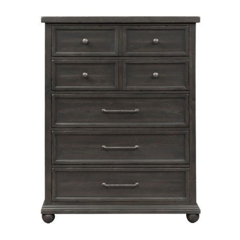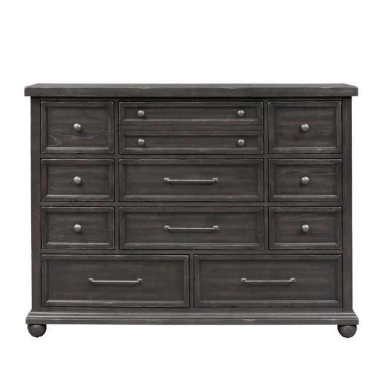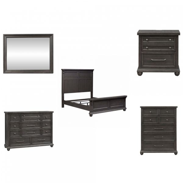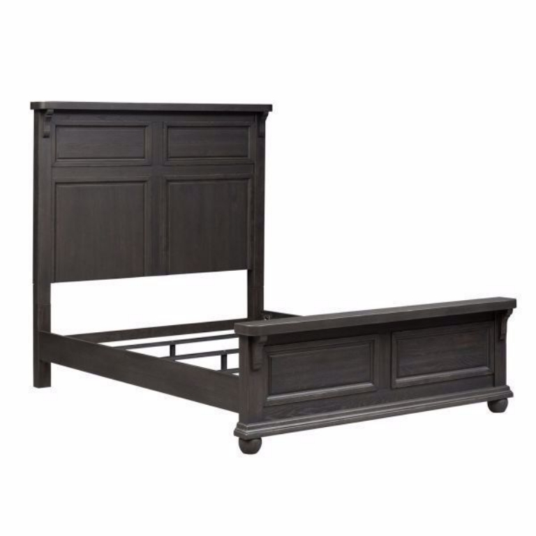 Make a statement with the large-scale Harvest Home Bedroom Group. The chalkboard finish is highlighted by saw cut hewing that adds a timeworn feel. Crafted by rubberwood solids with knotty white oak veneers, this group features wide cap rails and bun feet. Planked panels on the headboard and footboard are accented by decorative corbels, making a striking first impression. Never question the reliability of this group for years to come!