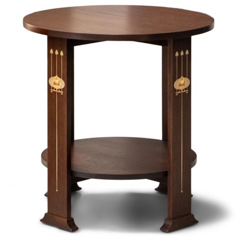 A shoe-foot style base, fixed bottom shelf, and a Viking inlay motif on all legs make this lamp table a standout piece. Available in solid oak or cherry.