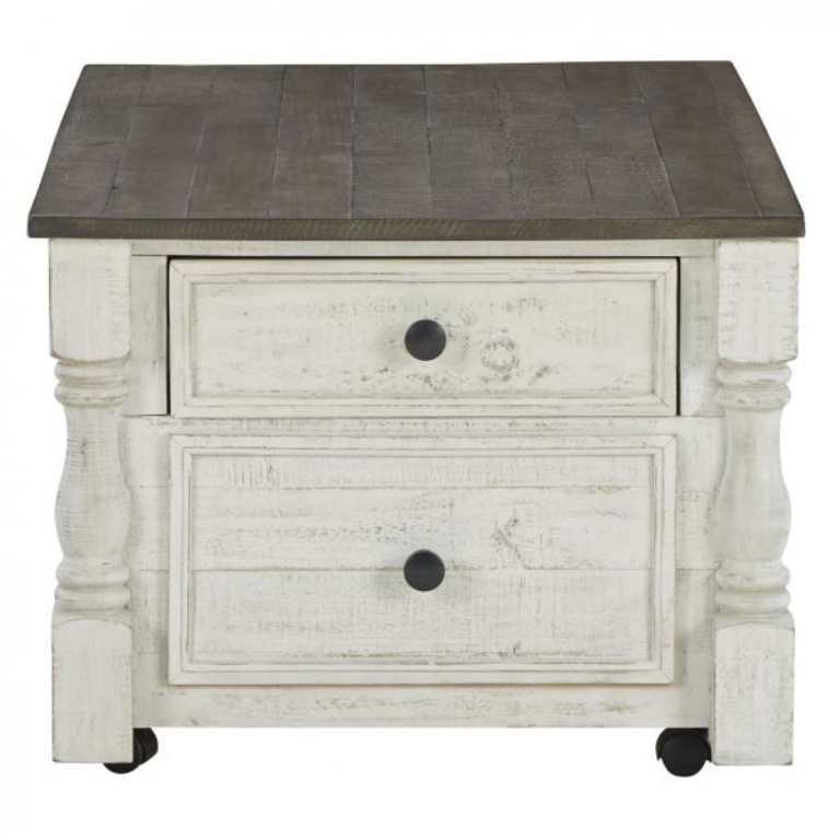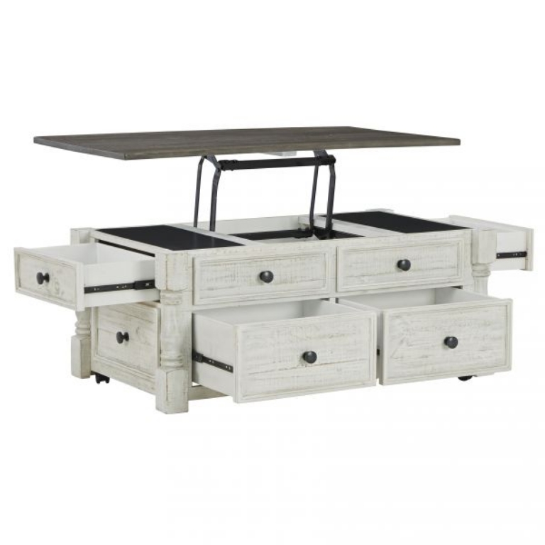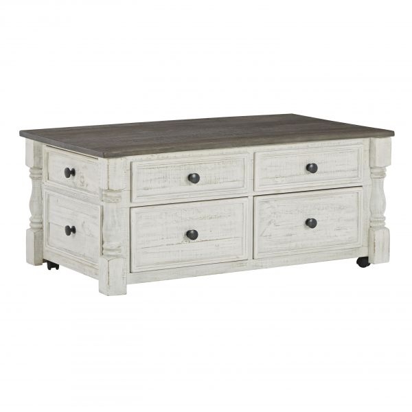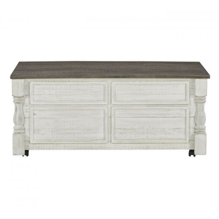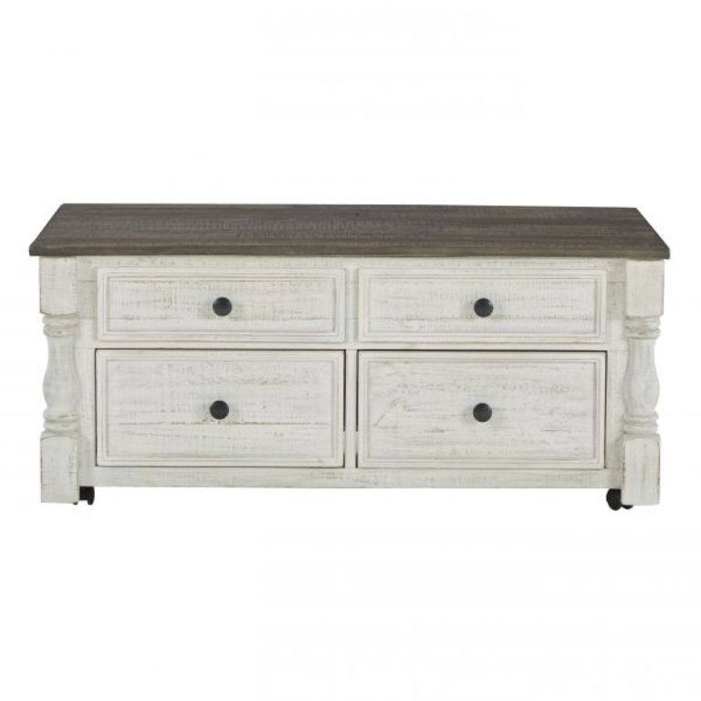 What a fresh interpretation of the classic country style. Inspired by American farmhouse craftsmanship but elevated sensibility, this lift-top coffee table blends distinctive details such as turned post accents and raised drawer fronts for a substantial look that feels right at home. Those who appreciate rustic character should take note of the table’s thick crown molding, beautified with a vintage two-tone finish. It features four storage drawers, a small concealed storage tray under the lift top, and robust legs ready to stand the test of time.