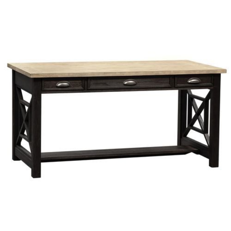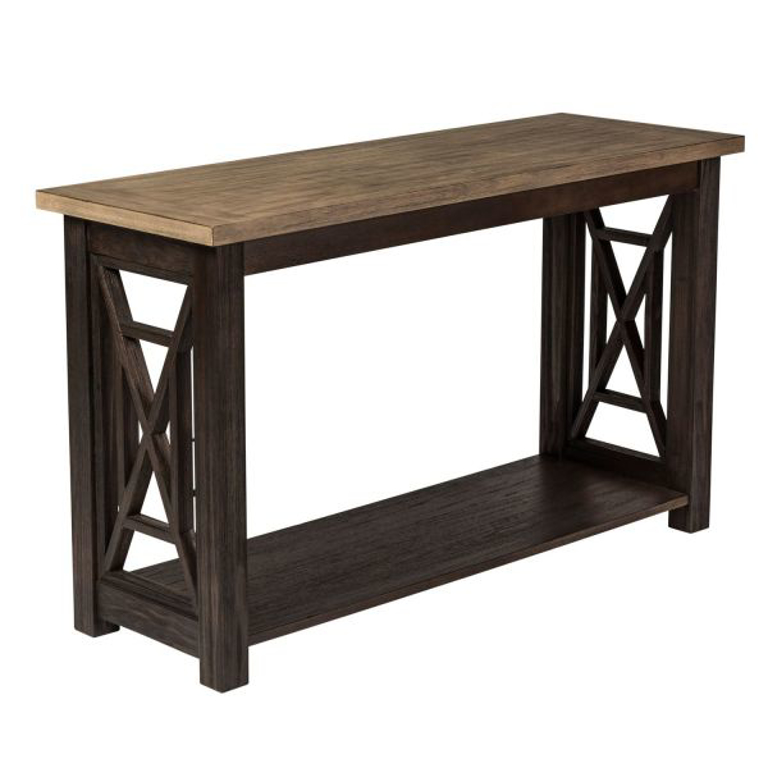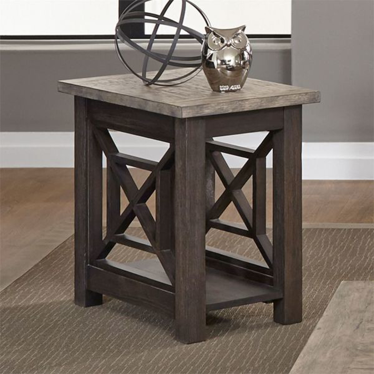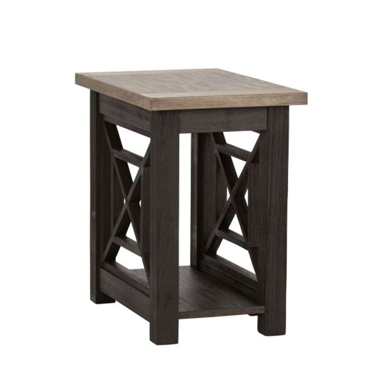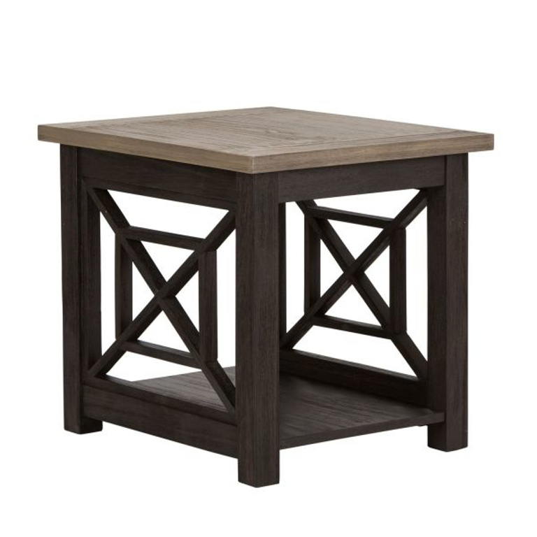 Enhance your space with the Heatherbrook chairside table. Crafted of poplar solids and acacia veneers, this piece features a charcoal and ash finish, bottom shelf for additional storage, appealing open grid end panels, anchored by a block leg design. This unique chairside table would be a wonderful accent piece in any home.