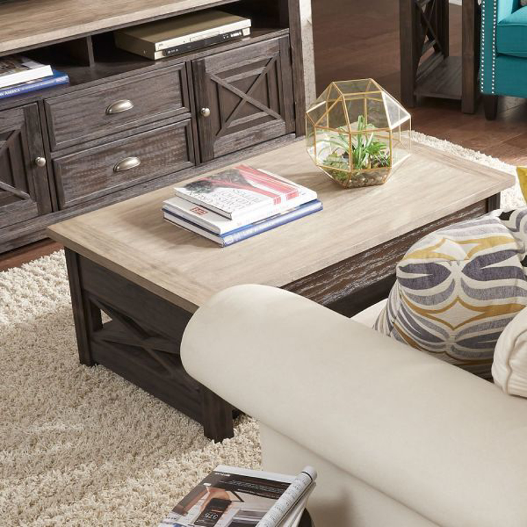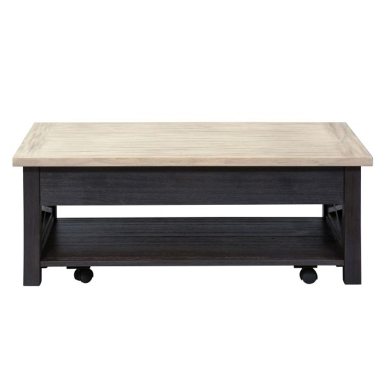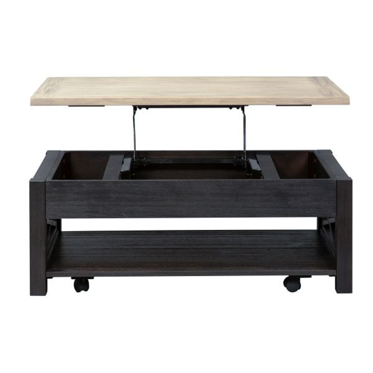 Transform your space with the Heatherbrook lift top cocktail table. Crafted of poplar solids and acacia veneers, this piece features a charcoal and ash finish, a top with the ability to extend to a height of 27â€, bottom shelf for additional storage, appealing open grid end panels, casters for easy moveability, anchored by a block leg design. This one of a kind lift top cocktail table would be a wonderful accent piece in any home.
