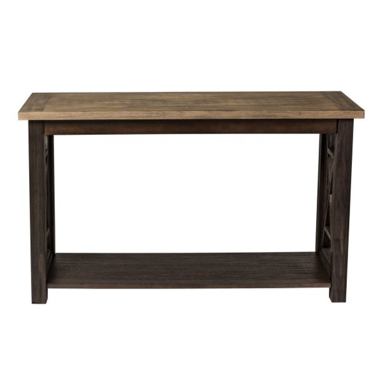 Accent your space with the Heatherbrook sofa table. Crafted of poplar solids and acacia veneers, this piece features a charcoal and ash finish, one lower level shelf for additional storage, appealing open grid end panels, anchored by a block leg design. This one-of-a-kind sofa table would be a wonderful accent piece in any home.