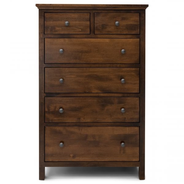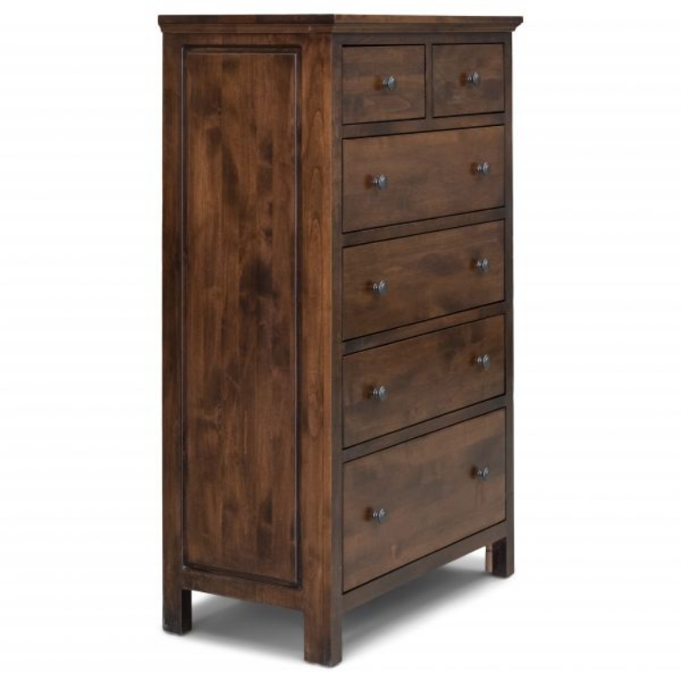 This natural, strong, and spacious chest is exactly what you and your bedroom have been looking for. The piece is made right here in America from strong Alder solids. The drawers are constructed with dovetail joinery and full extension ball bearing glides for durability and smooth use. The bottom drawer serves as a blanket drawer for added functionality, while the raised panel sides and clean block feet add some subtle detailing.