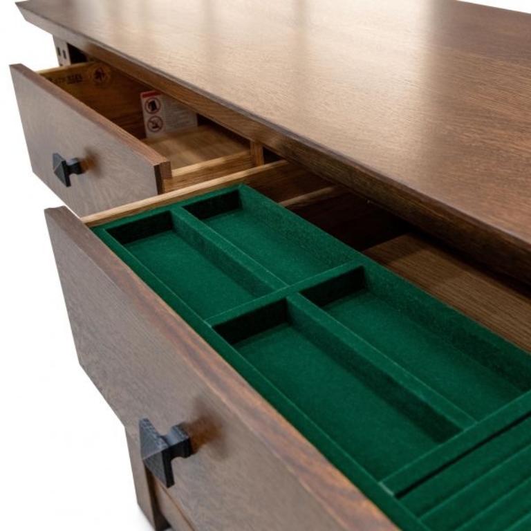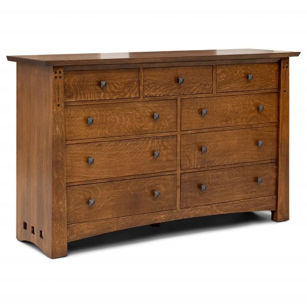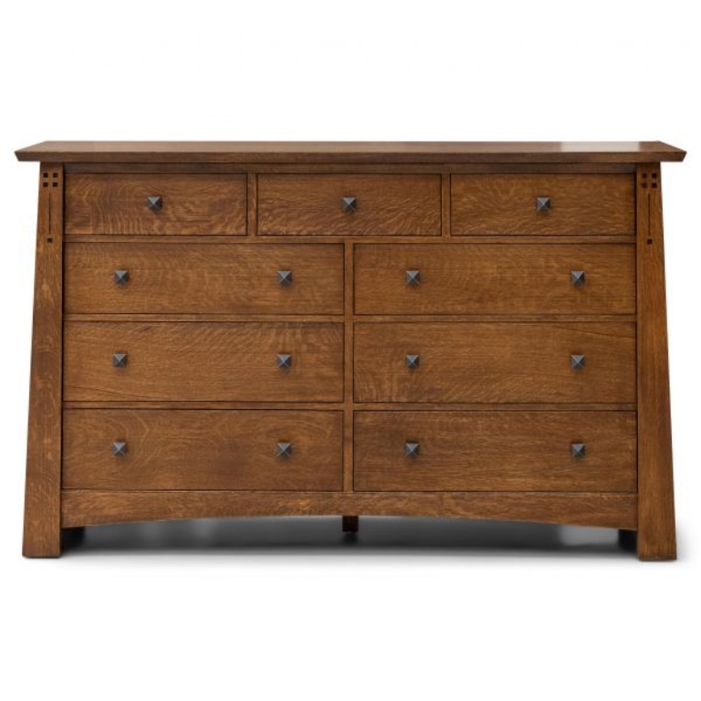 Within a gorgeous silhouette, the Highlands Master Dresser features nine drawers with square pyramidal pulls. Laser etching and pierced cutouts on its tapered posts accentuate its mission-inspired heritage. The top center drawer includes a sliding jewelry tray. Also available in various finishes of your choice.