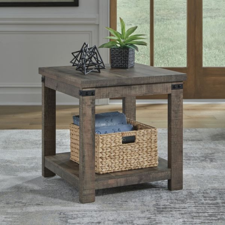 Keep your aesthetic chic and approachable with this charming end table. The piece has an effortless beauty, with a replicated aged barn wood pattern and matte black metal accents adding vintage-inspired elegance. Combining elements of fashion and function, the lower shelf is ideal for displaying decor or holding a storage basket.