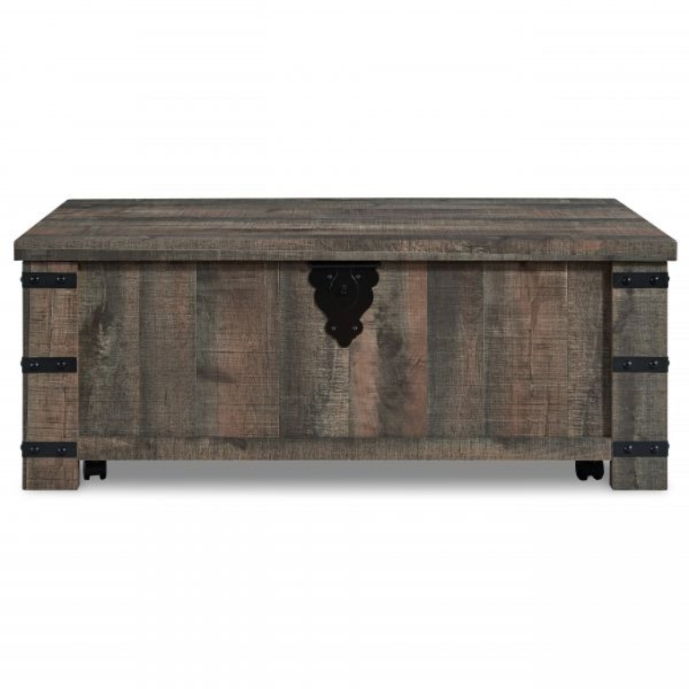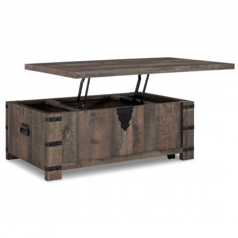 Keep your aesthetic chic and approachable with this charming coffee table. The piece has an effortless beauty, with a replicated aged barn wood pattern and matte black metal accents adding vintage-inspired elegance. Combining elements of fashion and function, the lift-top design offers a table area for dinner, a movie, or working from home on your laptop.