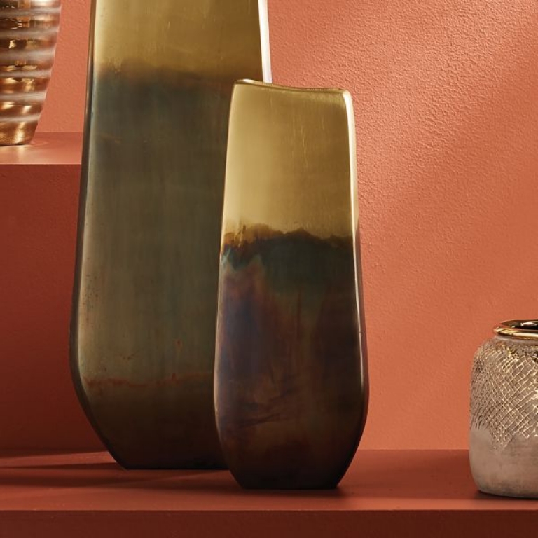The asymmetrical shape and ombre look are not even the most interesting attributes of the Jude Vase. The smooth texture and depth of color make it truly captivating. Decorative interior use only. Do not use with water or plant directly into. Use only with inner pot or liner. Do not use harsh chemicals. -Gold/Bronze Ombre