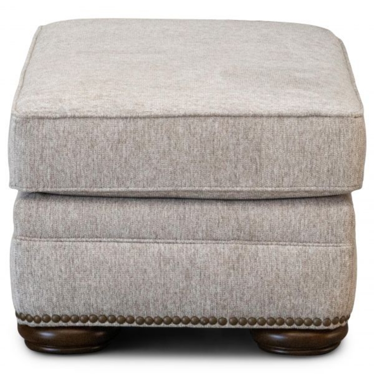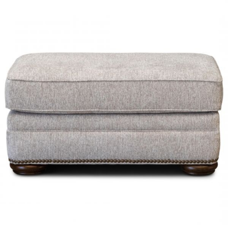 Elevate your living space with the Knox Ottoman by England Furniture. This stationary ottoman features a plush block foam cushion for ultimate comfort and is accented with elegant antique brass nailhead trim. Supported by sturdy wood bun feet, it seamlessly combines style and durability. Perfect as a footrest or extra seating, the Knox Ottoman adds a sophisticated touch to any room.