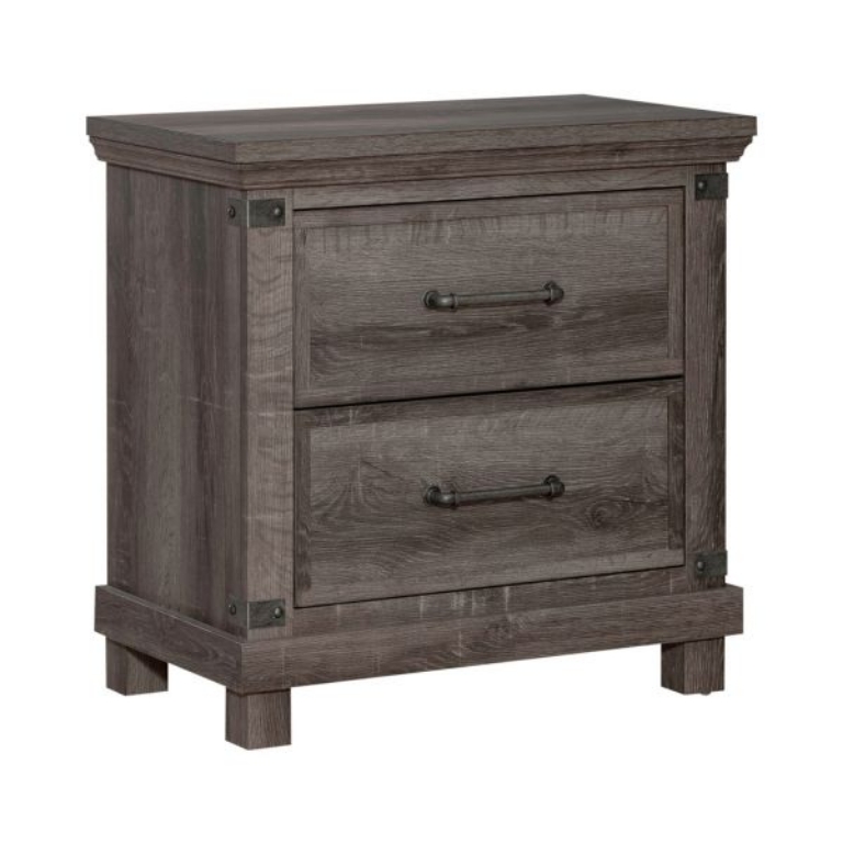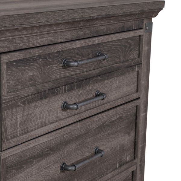 Hit the pause button on your hectic life with the Lakeside Haven six-drawer dresser. Crafted with excellence using a rubberwood solid frame with 3D Paper Laminate, this piece features a Brownstone finish. Hammered metal corner accent plates, along with wood-framed drawer fronts and Antique Pewter bar pull hardware, add visual appeal. The top two drawers feature bluff-cut drawer fronts, giving the illusion of multiple smaller drawers while still offering deep storage. Clean lines and block feet round out the rustic cottage look. The urban living design and the rustic charm or cottage appeal of the Lakeside Haven six-drawer dresser offer style, substance, and handcrafted character.