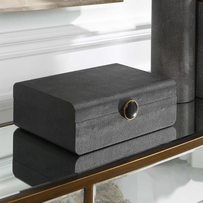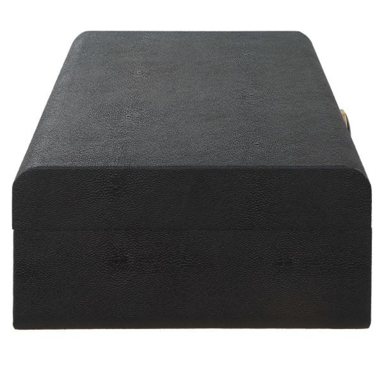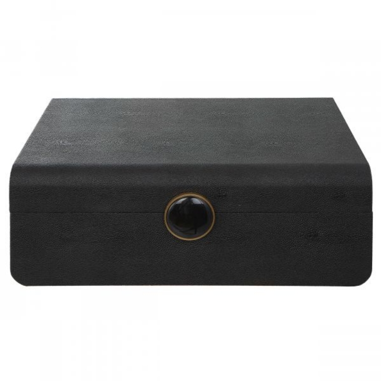 Inspired by the Art Deco era, the Lalique Black Box showcases a faux black shagreen wrapped exterior accented by a brushed antique brass and black enamel closure. The interior is finished in matte black.