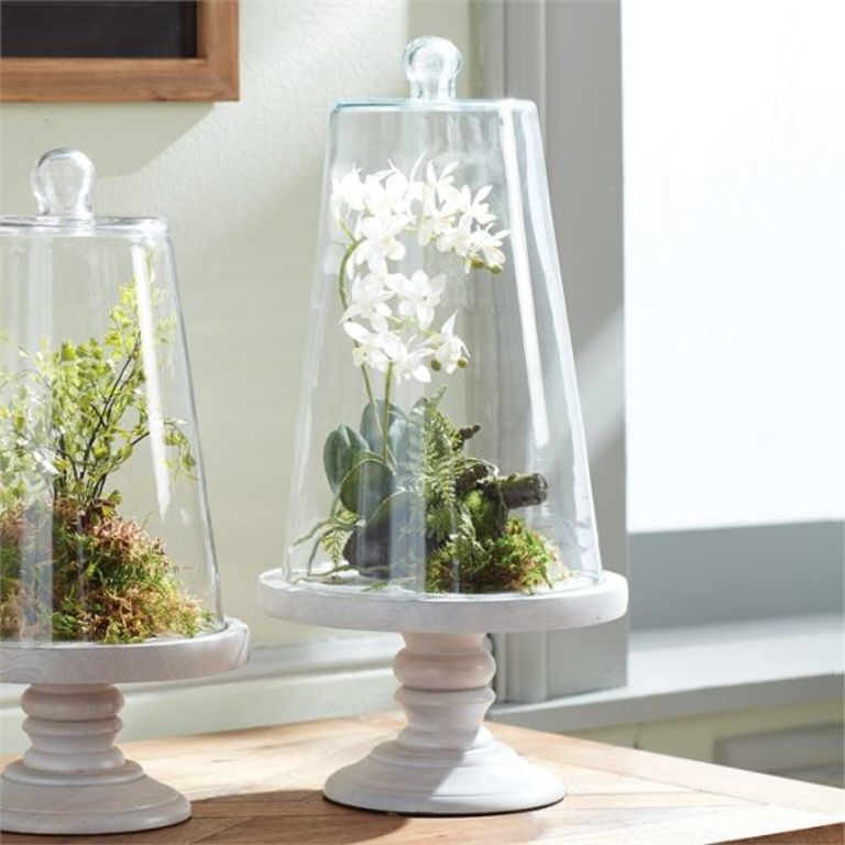 Classic in design with a whitewashed turned wood base, this cloche is light and lovely. A beautiful way to display natural elements, flameless candles or ornaments.