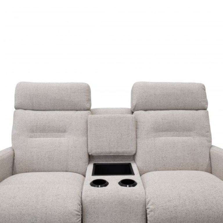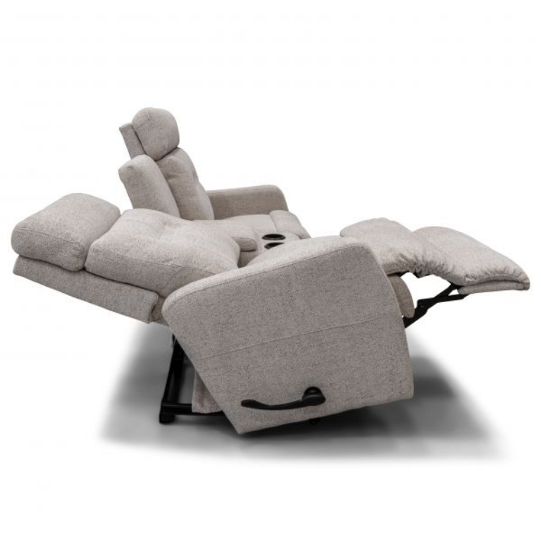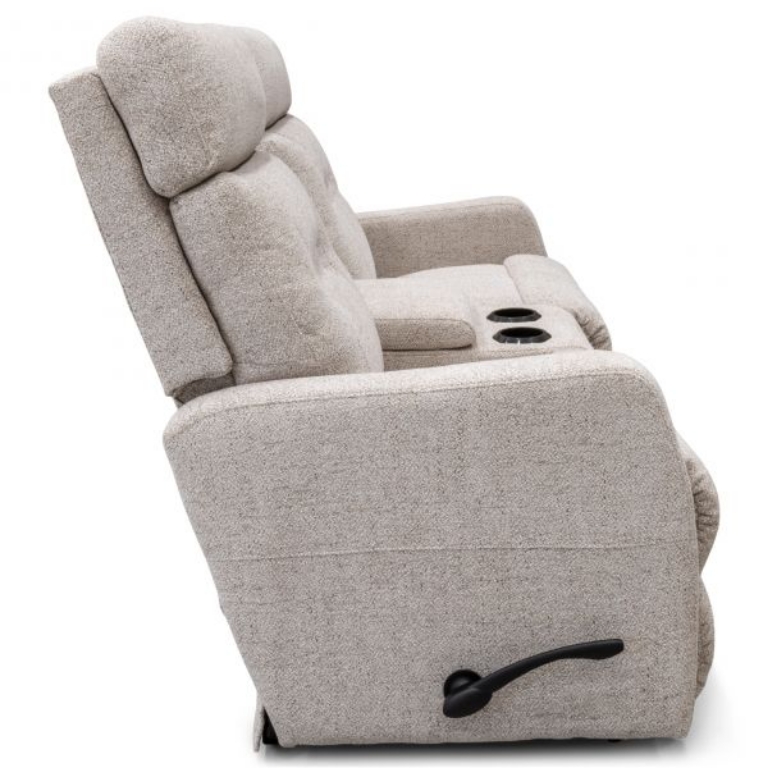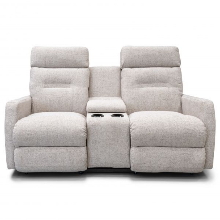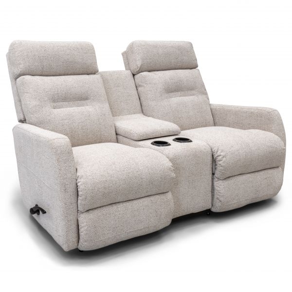 The Lennon Wall Reclining Loveseat with Console blends modern cozy style with convenience. Handles adjust tall, tailored backs, sleek chaise seats and legrests. A center console puts drinks and remotes in easy reach! And it sits inches from a wall. Customizable in store with your choice of fabrics and other upgrades.