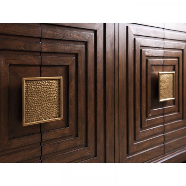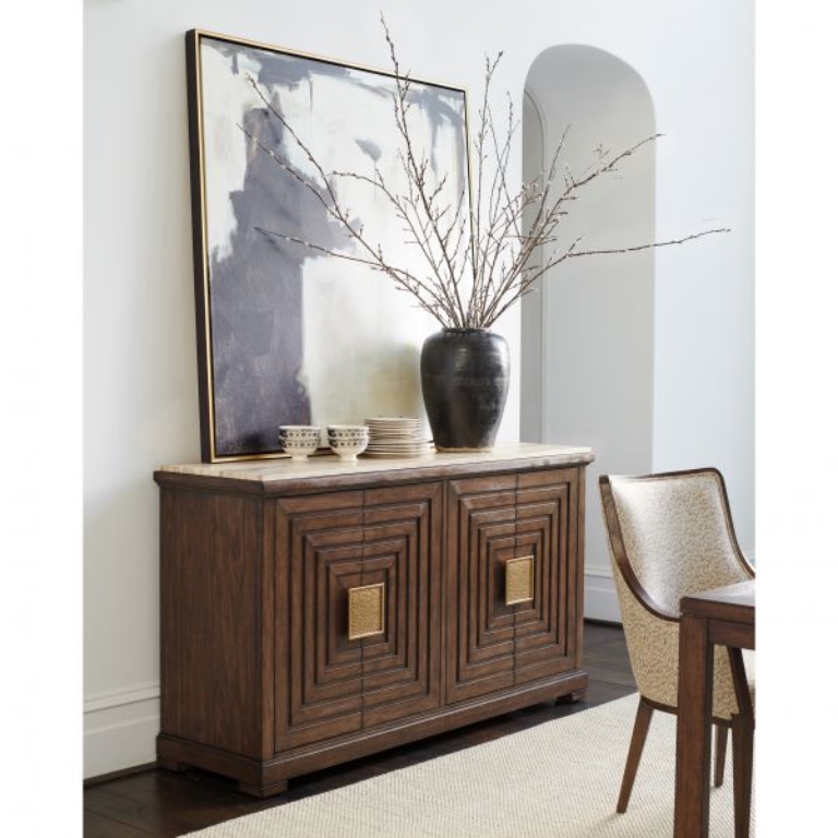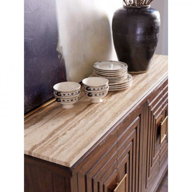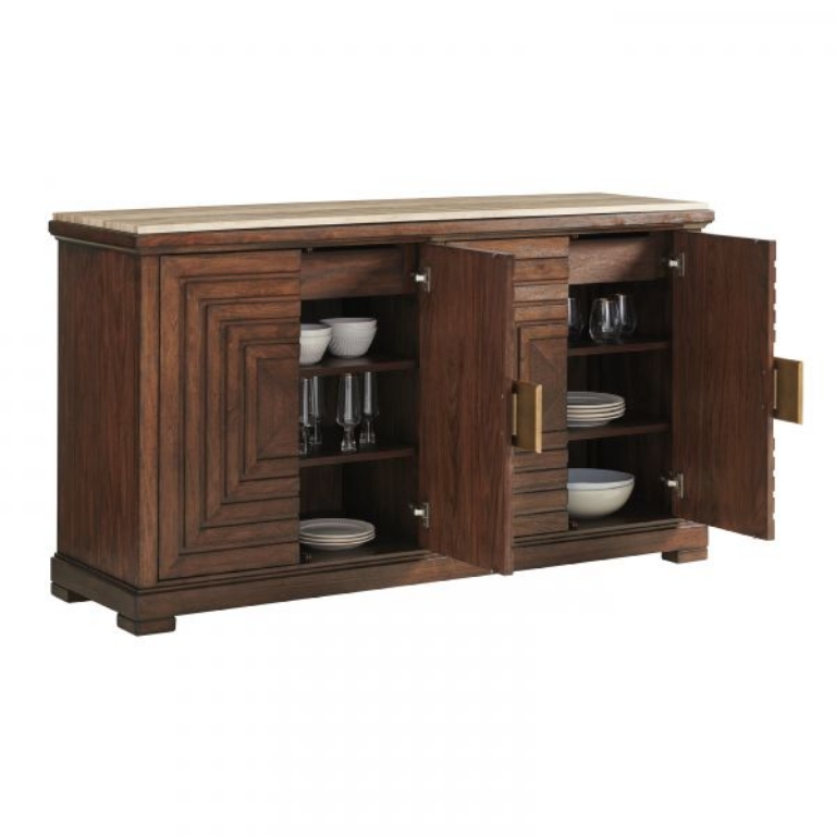 The architectural design of the doors and signature hardware make a striking design statement. Behind the doors are two felt-lined drawers at the top and four adjustable shelves below. One of the drawers is divided for silver storage. The Los Gatos buffet features a lay-on tiger brown travertine with a brown felt underside.