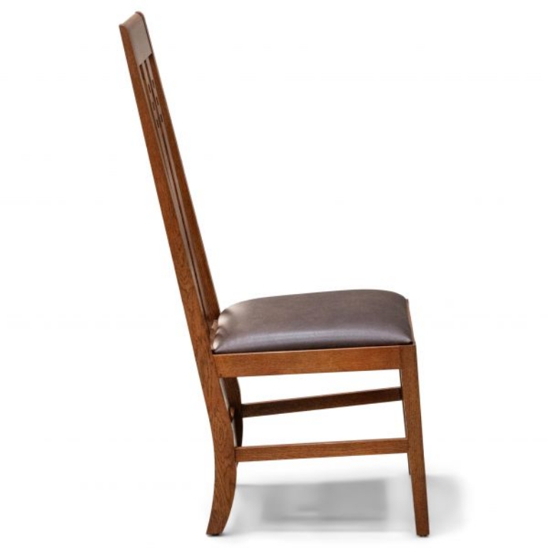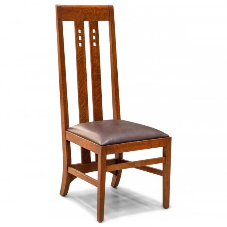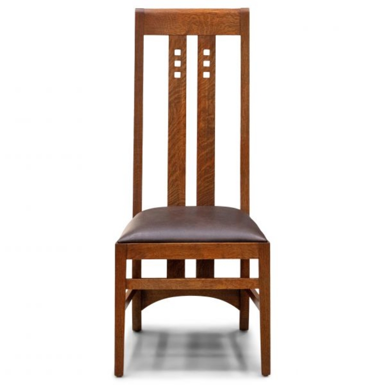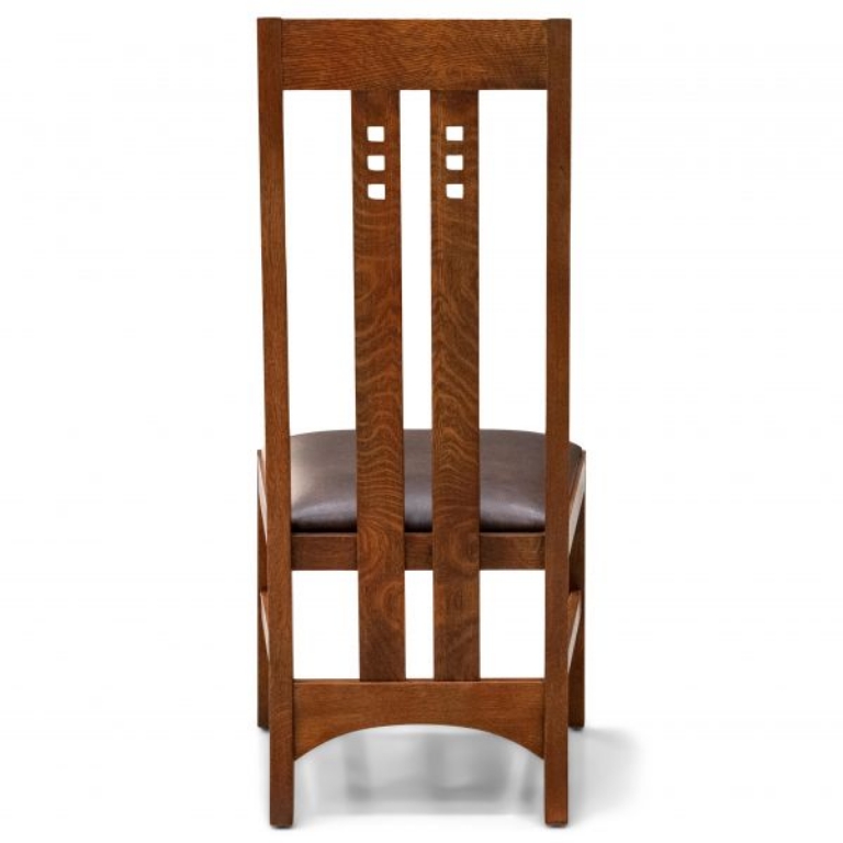 Inspired by Scottish Arts and Crafts designer Charles Rennie Mackintosh, these chairs pay tribute to his harmonious style. Three pierced squares in the back slats are an iconic Mackintosh detail, and those same slats extend uninterrupted to the bottom back rail. Available in solid oak or cherry with various finishes of your choice.