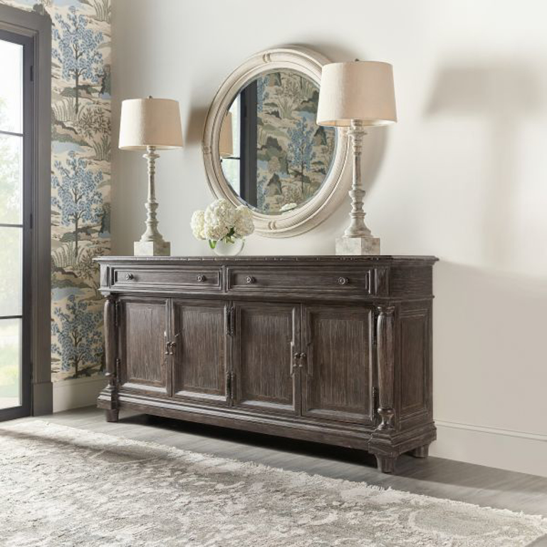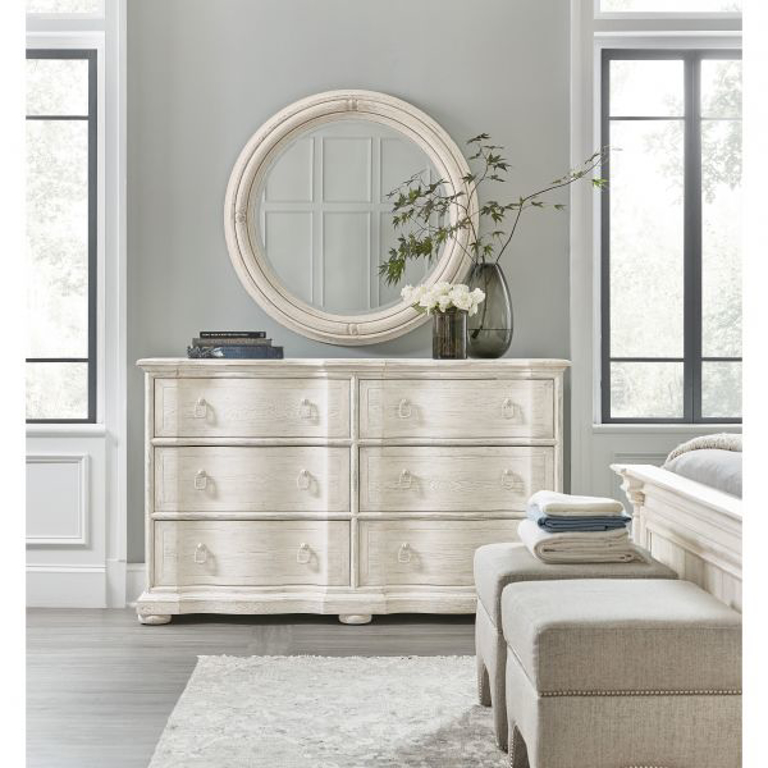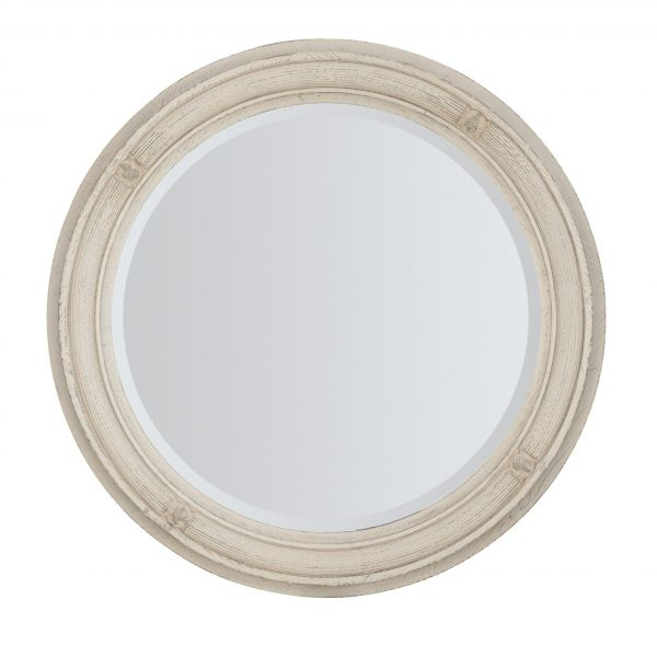 Inspired by antiques and architecture of vintage character, the Traditions Mirror has beveled glass and a chic round shape. Crafted of Pine, the mirror is finished in Magnolia, a soft white finish with a sophisticated casual appeal. Inspired by a two-week trip through Europe in search of architecture and antiques full of vintage character, Hooker Furniture introduces the Traditions Collection.