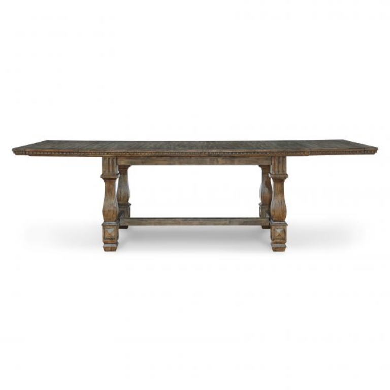 Curate a vintage-inspired retreat from the modern world. The Markenburg extension table is draped in a dreamy finish amidst traditional styling. Details such as thick profiled base mouldings, fluted pilasters and inset dentil trim provide a picturesque finishing touch.
