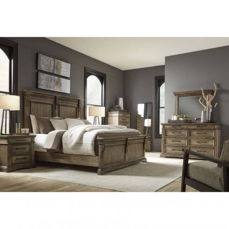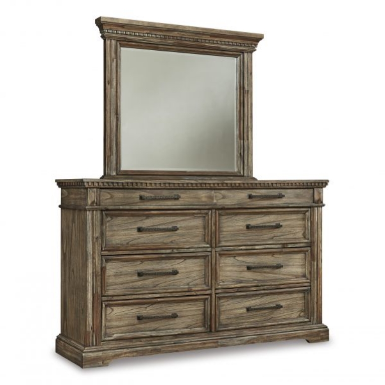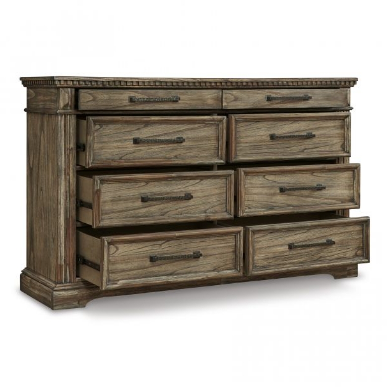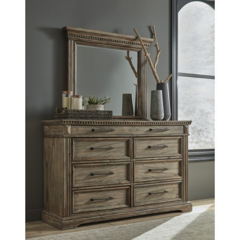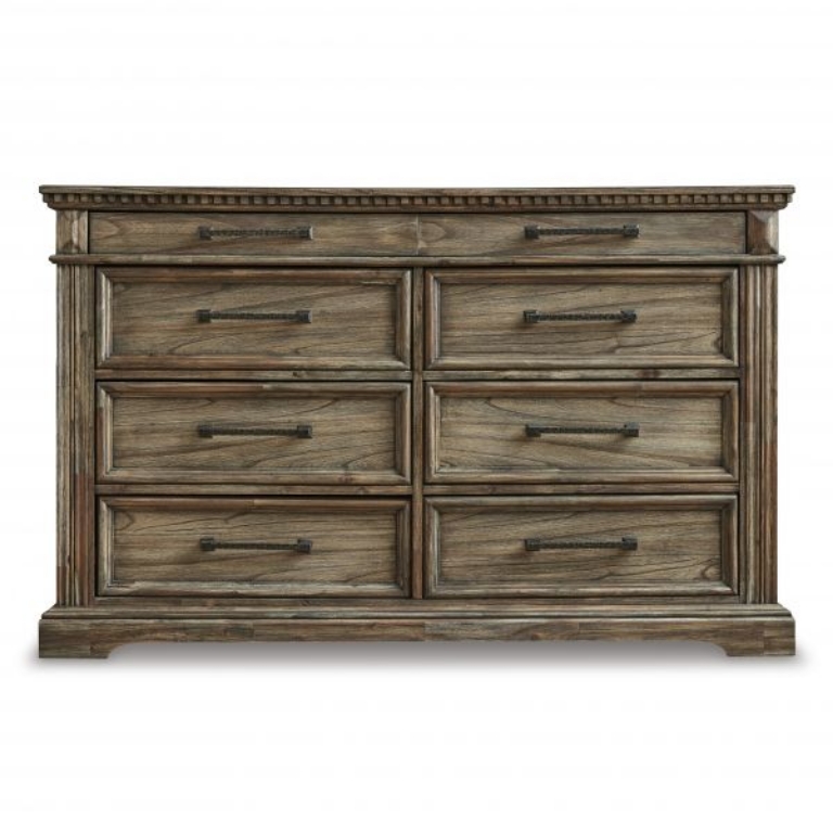 Curate a vintage-inspired retreat from the modern world without setting foot in a flea market. This dresser is draped in a dreamy finish that enhances the wood's character, while dark pewter-tone bar pulls on smooth-gliding drawers have a hammered feel. Fluted details and robust breakfront crown molding provide picturesque finishing touches.