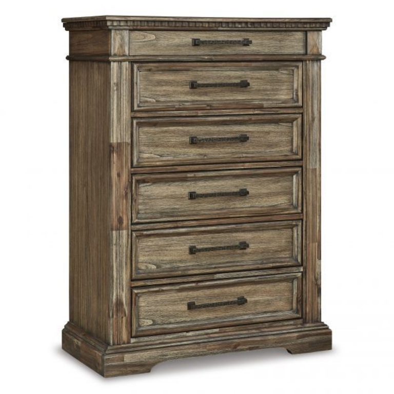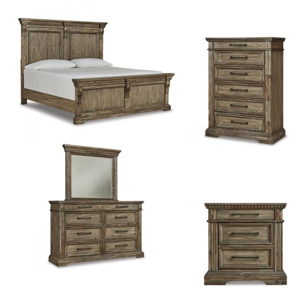 Curate a vintage-inspired retreat from the modern world without setting foot in a flea market. The Markenburg king panel bed is draped in a dreamy finish that brings out the wood's natural beauty. Stylized corbels and a subtle trim provide picturesque finishing touches. This group includes everything you need to complete your bedroom suite.