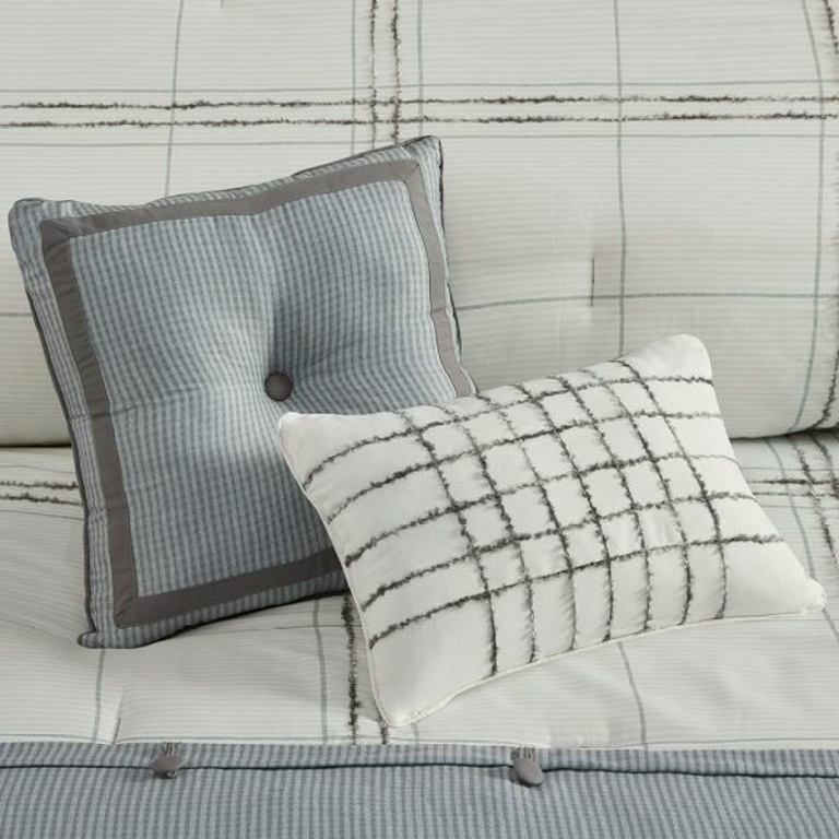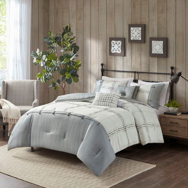 Give your bedroom a charming farmhouse update with the Maxwell Queen Comforter Set. The soft herringbone comforter features a pieced design with a plaid print, trims, and button details to create a cozy cottage look. The 2 matching shams pair handsomely with the comforter, while 2 decorative pillows add the finishing touches. Machine washable for easy care, this comforter set brightens up your bedroom and gives it a fresh farmhouse allure.