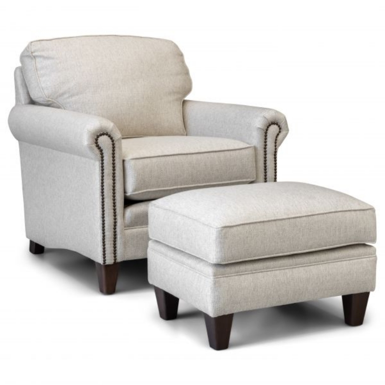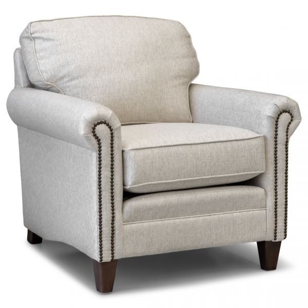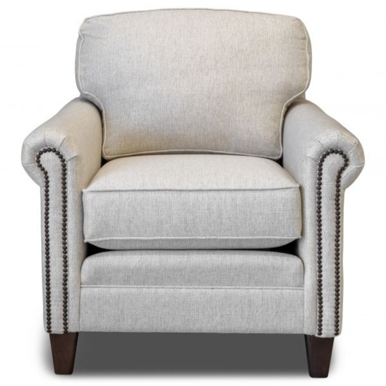 Add a classic appeal into your living space with the Mia Accent Chair by Smith Brothers Furniture. A beautiful and comfortable mid-sized chair perfect for smaller confined spaces. Hardwood frames, sinuous back springs and high-density cushion cores insure comfort and dependability for years to come. Panel arms feature nailhead trim that runs the length of the arm face to the tapered wood legs compliment the aesthetics of this chair. Semi-attached seat back keep this piece looking fresh and comfy.