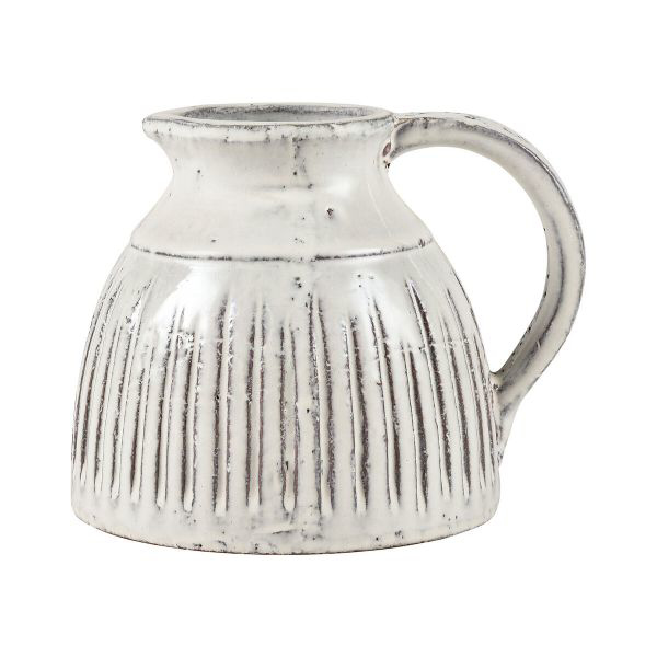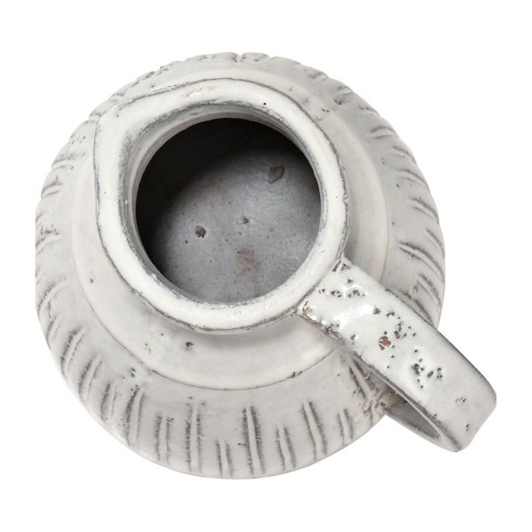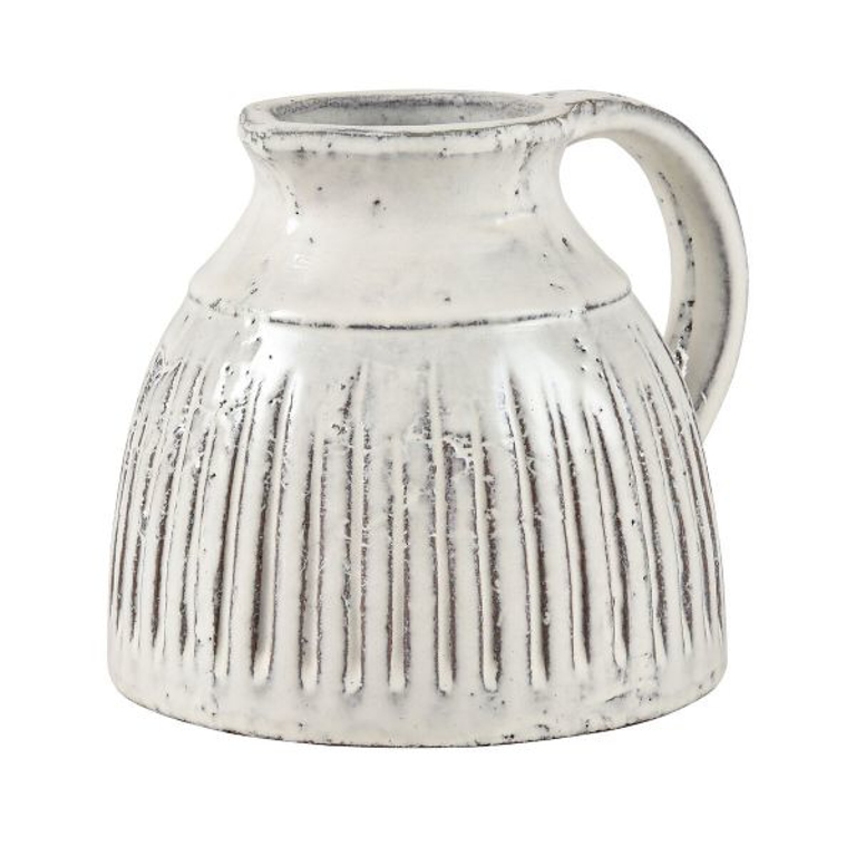 The Muriel small terracotta pitcher brings a subtle, rustic style. This textured piece features an aged finish in white. Place this piece on kitchen work tops or use it as a vase on living room side tables or consoles.