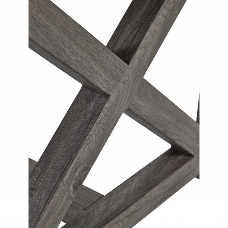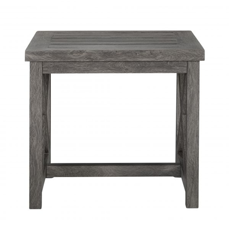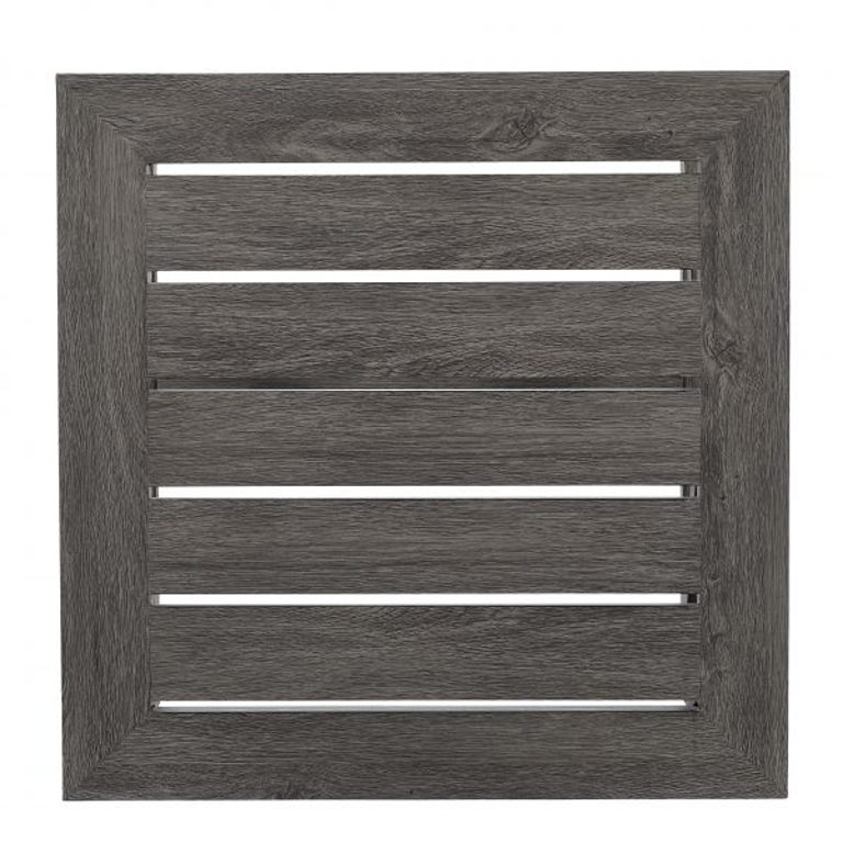 The tables in the Mystic Harbor collection are constructed in powder-coated aluminum and have the appearance of wood. Slatted tops and "X" side decor keep a casual feeling, and the warm gray color complements the group's wicker pieces.