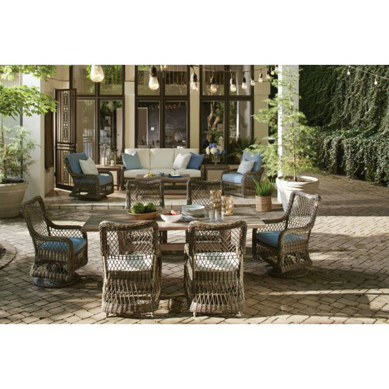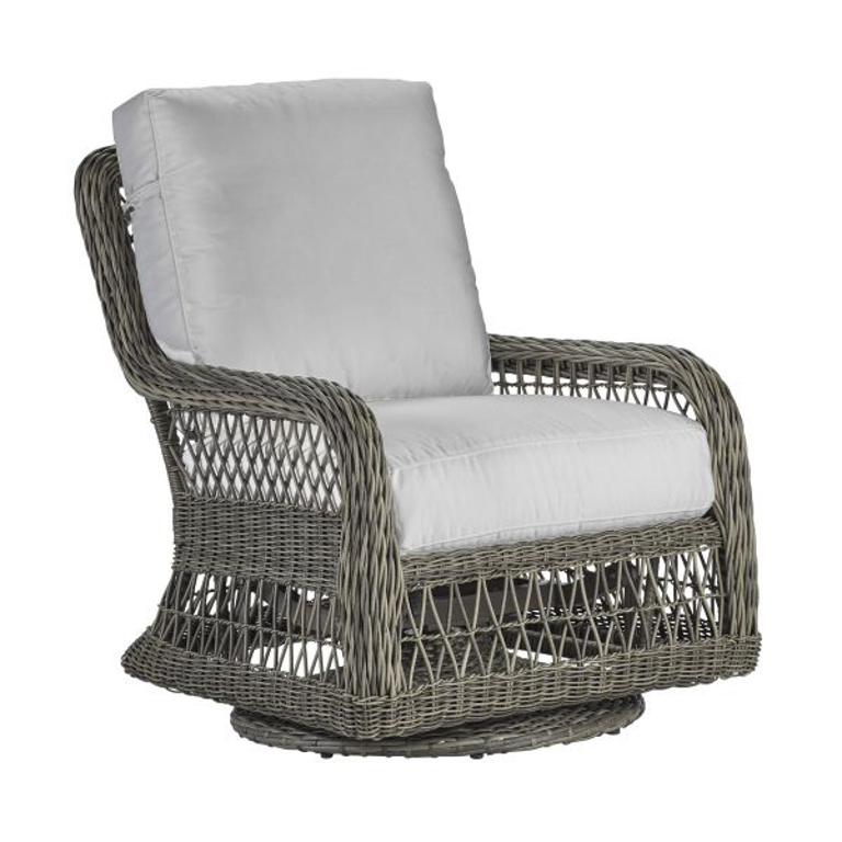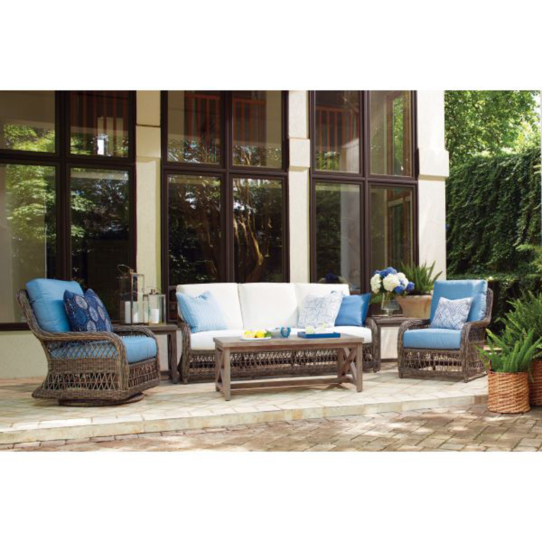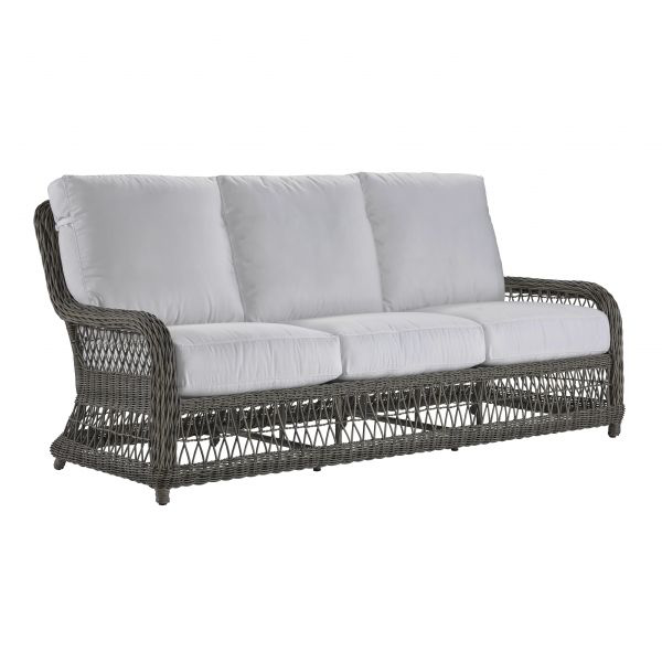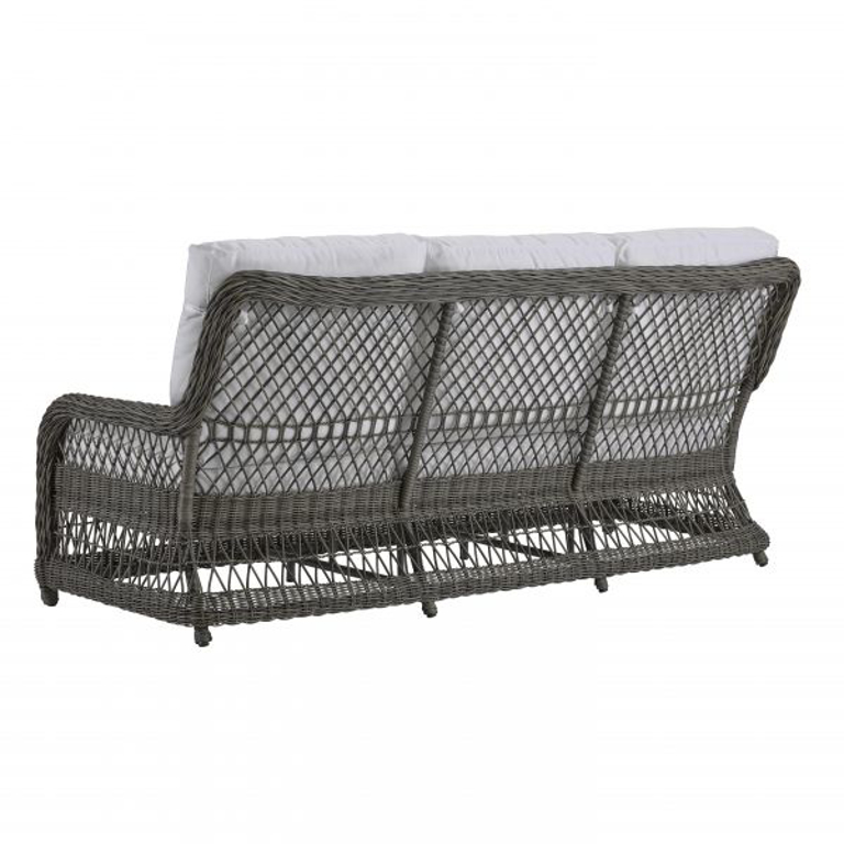 An "X" trellis motif gives a light and airy feeling to the classic wicker design of our Mystic Harbor sofa. Featuring our luxurious and plush outdoor cushion, you'll want to sink in and unwind in the unsurpassed comfort. Varying shades of warm French Grey all-weather wicker are hand-woven around the gentle curves of a premium quality aluminum frame and will endure any type of weather. Superior upholstery details feature cushions with welt-less box borders and French seaming.