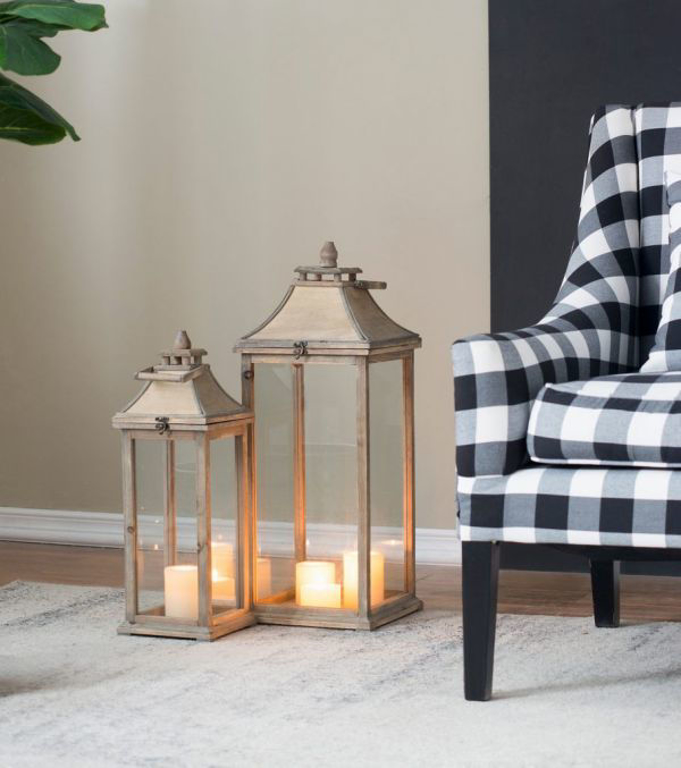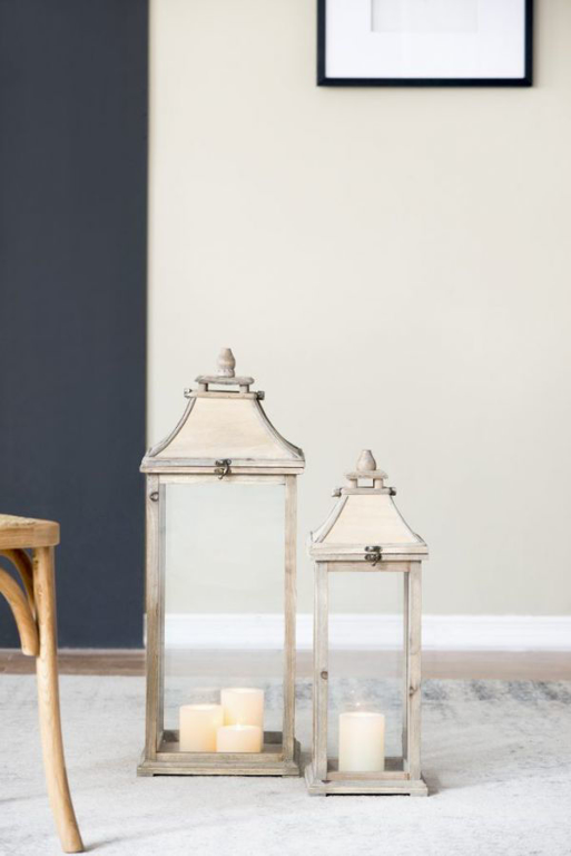 Display your favorite decorative candles in this lovely pair of candle lanterns. Sturdy wood and glass construction come together for a light and refreshing look with natural appeal. This set of two includes one large lantern and one smaller lantern.