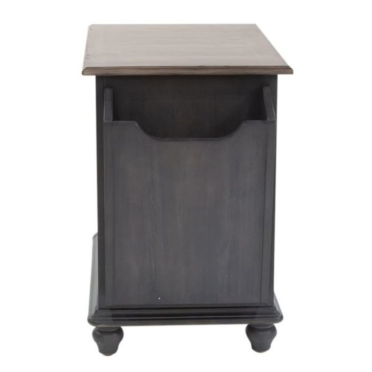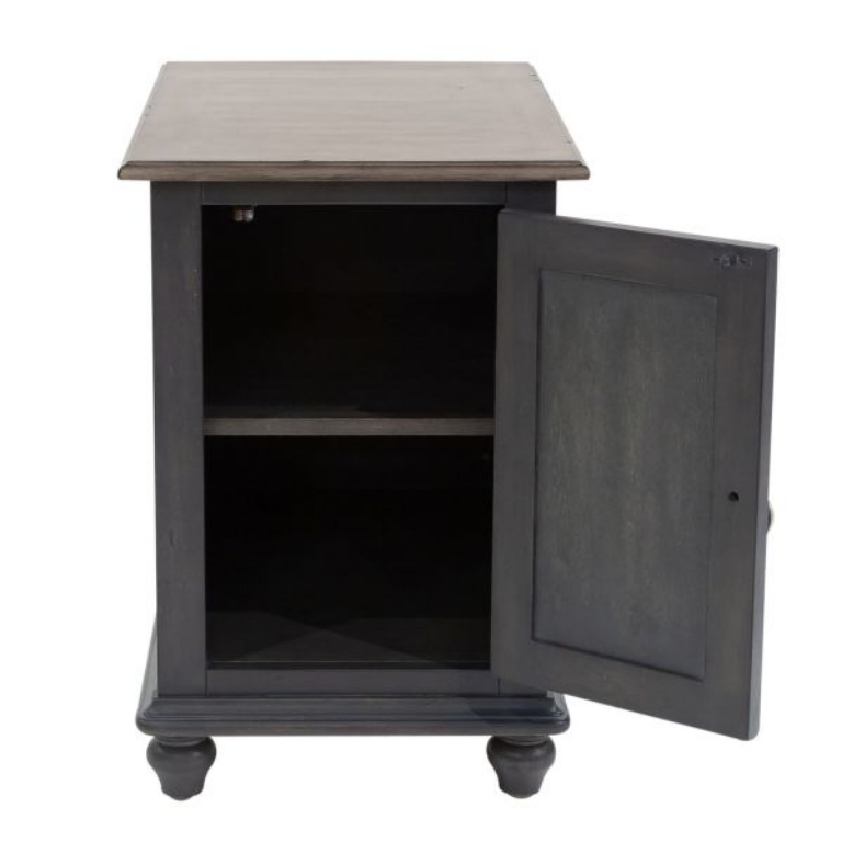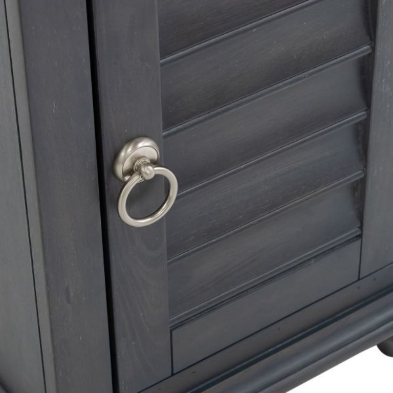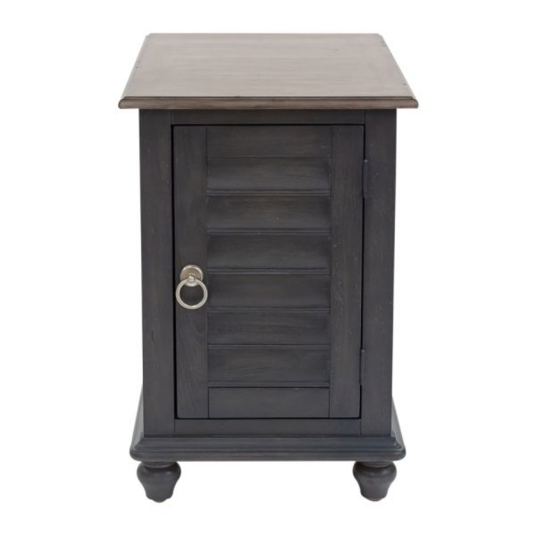 Create a relaxed interior look that works for coastal styles, country, and cottage interiors with the Ocean Isle chair side table. Crafted of rubberwood solids and New Zealand pine veneers, this piece features a slate finish with weathered pine, louvered accents on the door, a rear magazine rack enhancing storage, natural pine top, one adjustable shelf behind the door, and is accented by satin nickel drop ring hardware.