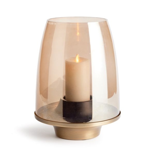 The sweeping tapered base of this contemporary design gives it a floating quality. The warm luster glass hurricane and matte brass finish only add its appeal.