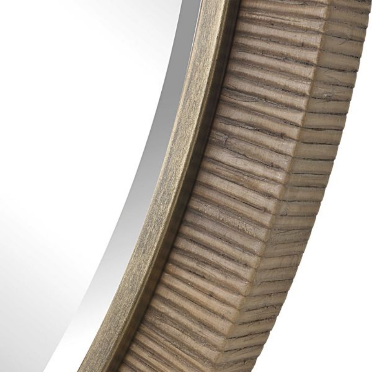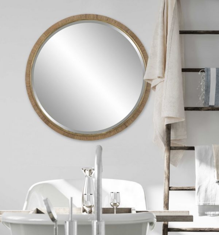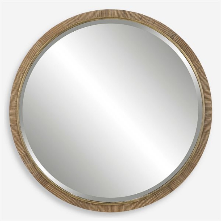 Discover the Paradise Round Wall Mirror, a stunning fusion of natural elegance and luxurious design. This piece adds organic warmth to your decor, featuring a frame expertly wrapped in naturally finished rattan. The frame is beautifully finished in a heavily antiqued gold leaf, providing a rich contrast and a dash of luxury. With a generous 1 1/4" bevel, this mirror not only adds depth and dimension to any space but also captures and reflects light in a way that brightens your room. Perfect for any setting seeking a blend of sophistication and natural charm, it's an eye-catching addition to your home décor.