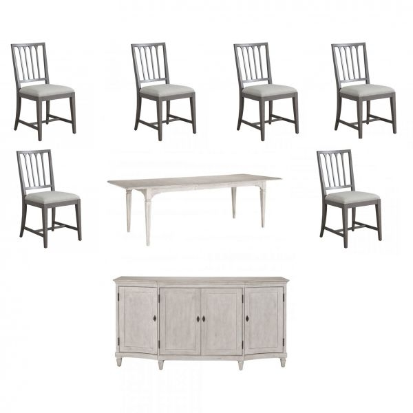 Transform dining areas into a warm and inviting retreat with the Rectangular Dining Table, an inspired furnishing designed with charmingly subtle detail work and finished in a versatile Dover White tone. Bring additional comfort and breezy refinement to dining spaces with the Slat Back Side Chair, a reimagined take on a classic silhouette finished in a complementing gray hue. To complete your dining group, the matching buffet provides ample storage and serving space.