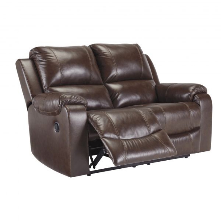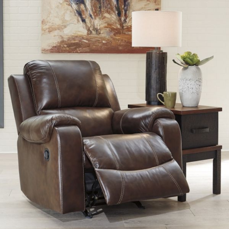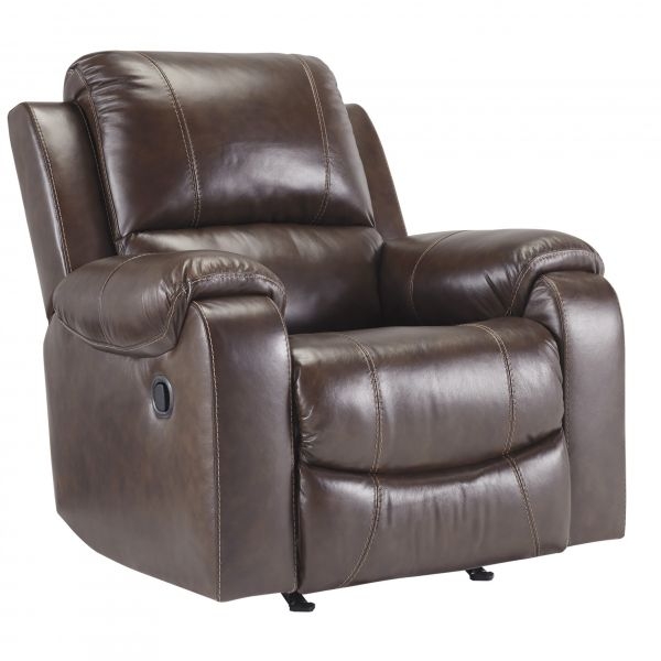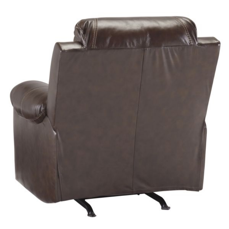Once you recline in this rocker recliner with the pull of a tab, you will not want to get up. It's that comfortable with a bustle back and padded ottoman. Its look is amazing with dramatic cut and sew lines, jumbo stitching and affordable mahogany leather match upholstery, which features top-grain leather in the seating areas with skillfully matched vinyl everywhere else—what a way to relax.