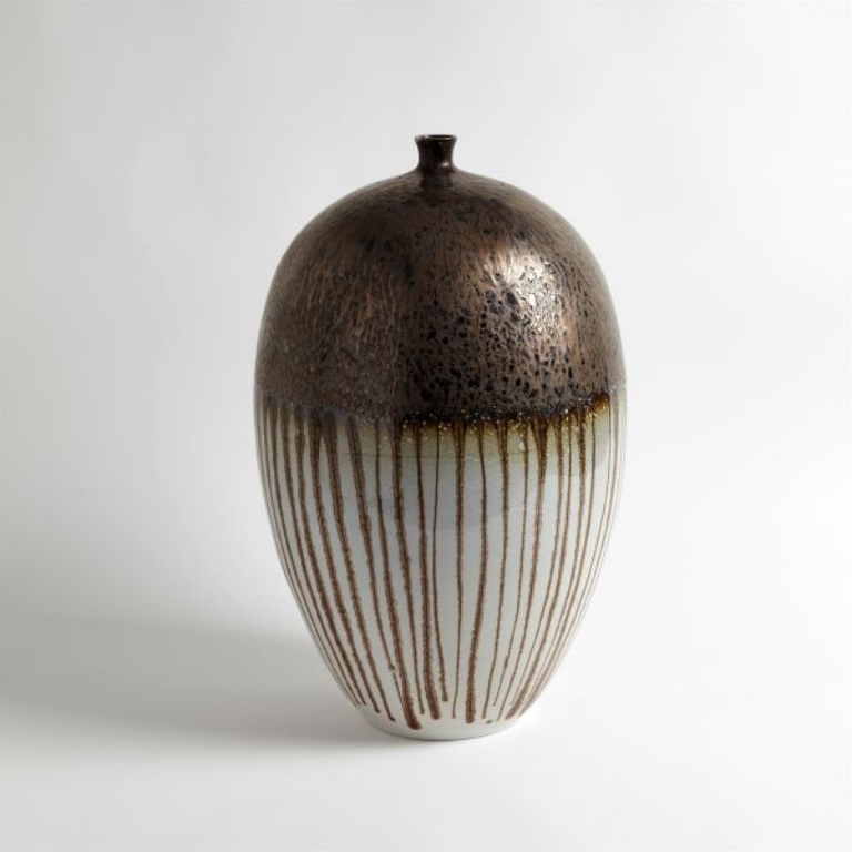 Slip molded Portuguese porcelain in the form of upside-down teardrops. Glazed in a reactive bronze, which "drips" down the body of the vase.