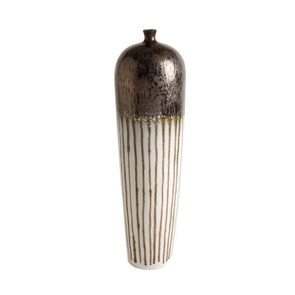 Slip molded Portuguese porcelain in the form of upside-down teardrops. Glazed in a reactive bronze, which "drips" down the body of the vase.