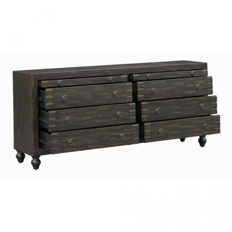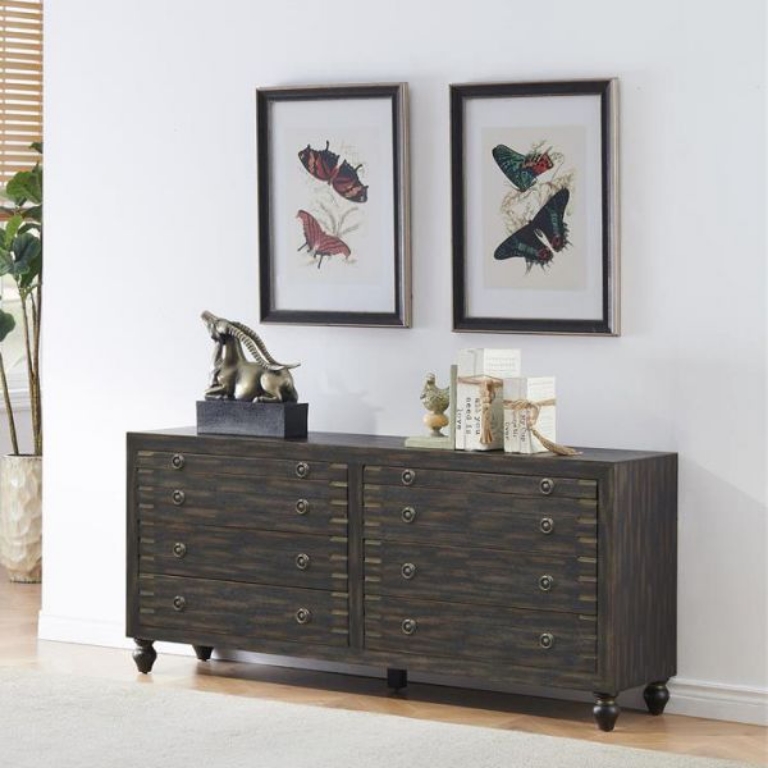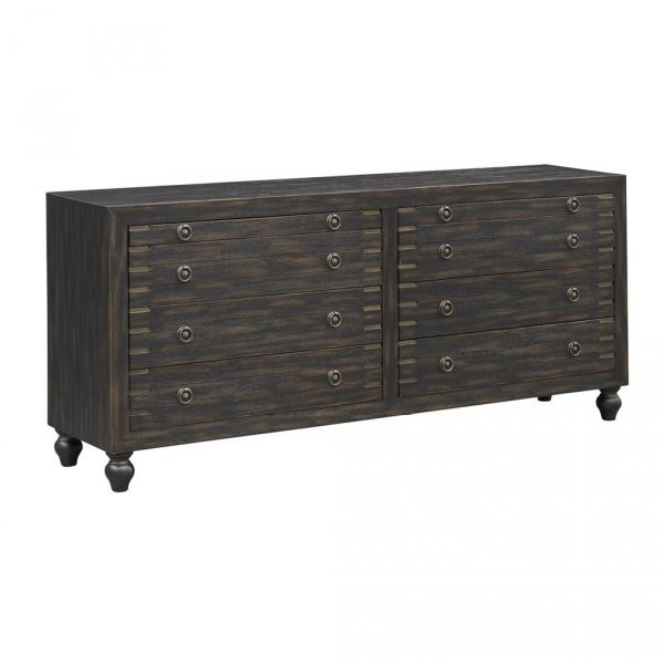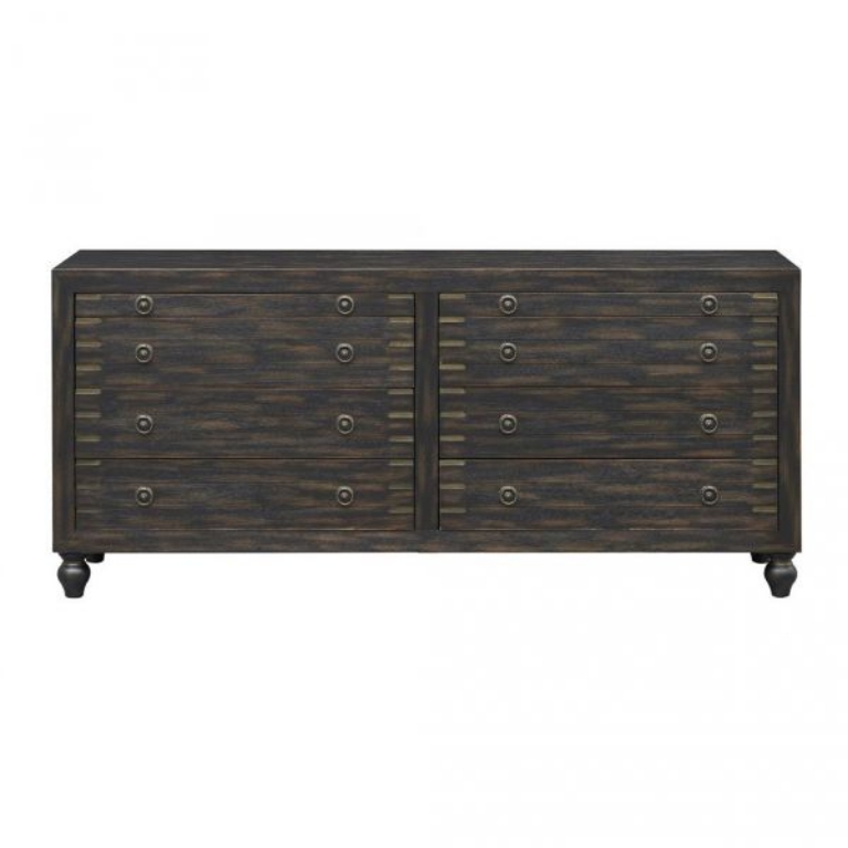 This versatile credenza works perfectly as a chic kitchen buffet or as a server in your dining room. A Maksim Black rub-through finish and dentil cutouts on the drawers bring character and charm to the table. This stylish piece is also multifunctional, with two pullout shelves perfect for displaying a charcuterie board or extra snacks when guests are over.