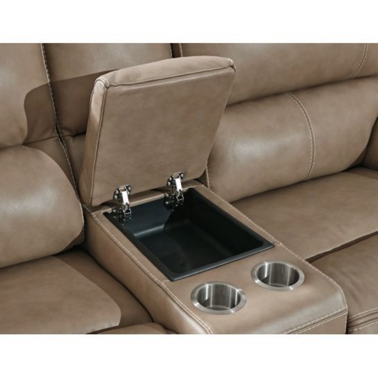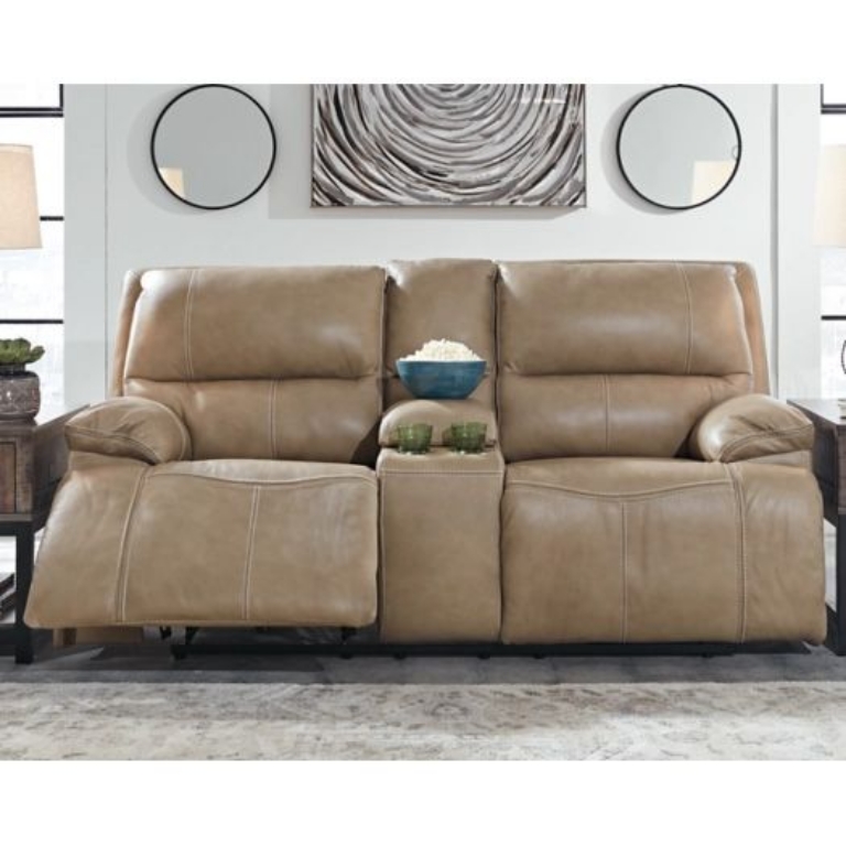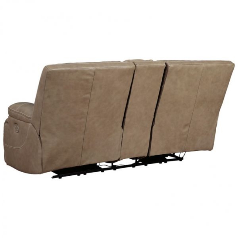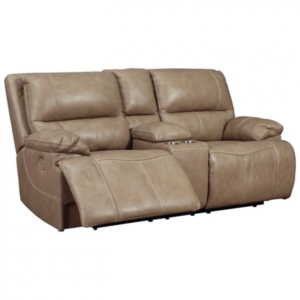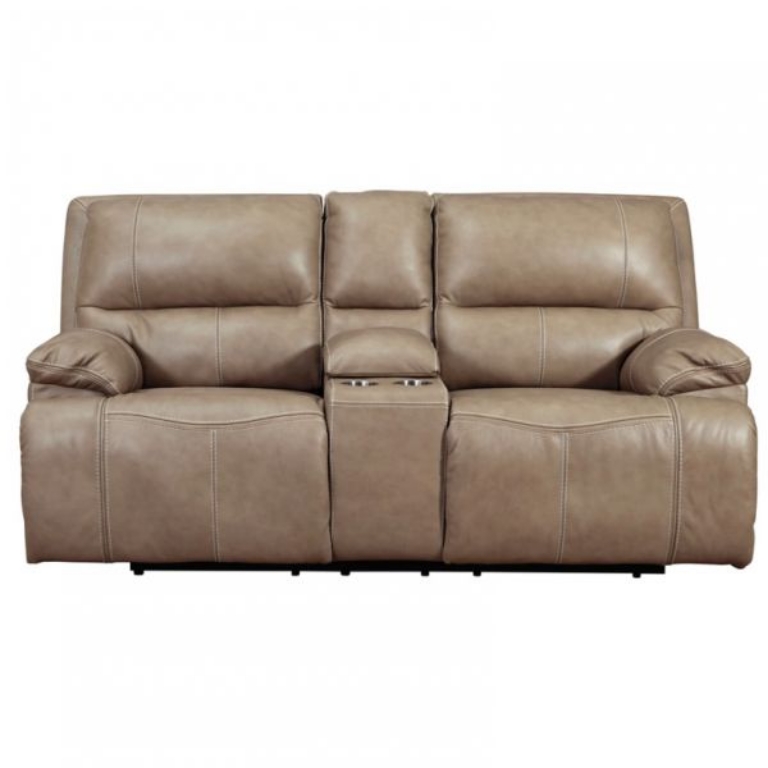 Life is much better when you can enjoy the pleasure of genuine leather—at a price to put you at ease. That's precisely what you get with this power reclining loveseat with an adjustable headrest. Thanks to genuine leather throughout the seating area, you have a reclining loveseat that feels like a million bucks but won't break the bank. Tailored to those with an eye for contemporary design, this power reclining loveseat is dressed to impress with an upscale matte finish, clean-lined divided back tufting, distinctive jumbo stitching, and chic pillow top armrests.